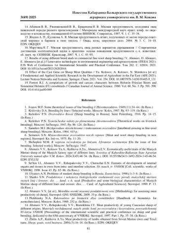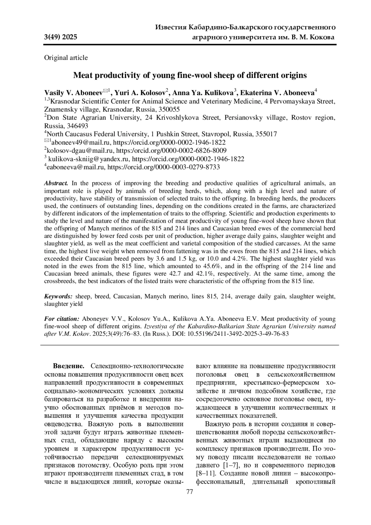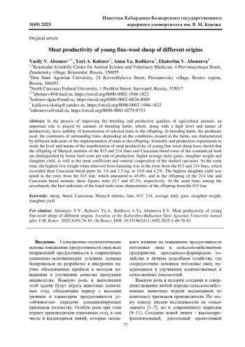 АБОНЕЕВ В. В., КОЛОСОВ Ю. А., КУЛИКОВА А. Я., АБОНЕЕВА Е. В. МЯСНАЯ ПРОДУКТИВНОСТЬ ТОНКОРУННОГО МОЛОДНЯКА ОВЕЦ РАЗЛИЧНОГО ПРОИСХОЖДЕНИЯ // ИЗВЕСТИЯ КАБАРДИНО-БАЛКАРСКОГО ГОСУДАРСТВЕННОГО АГРАРНОГО УНИВЕРСИТЕТА ИМ. В. М. КОКОВА. 2025. № 3 (49)