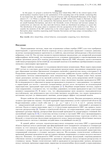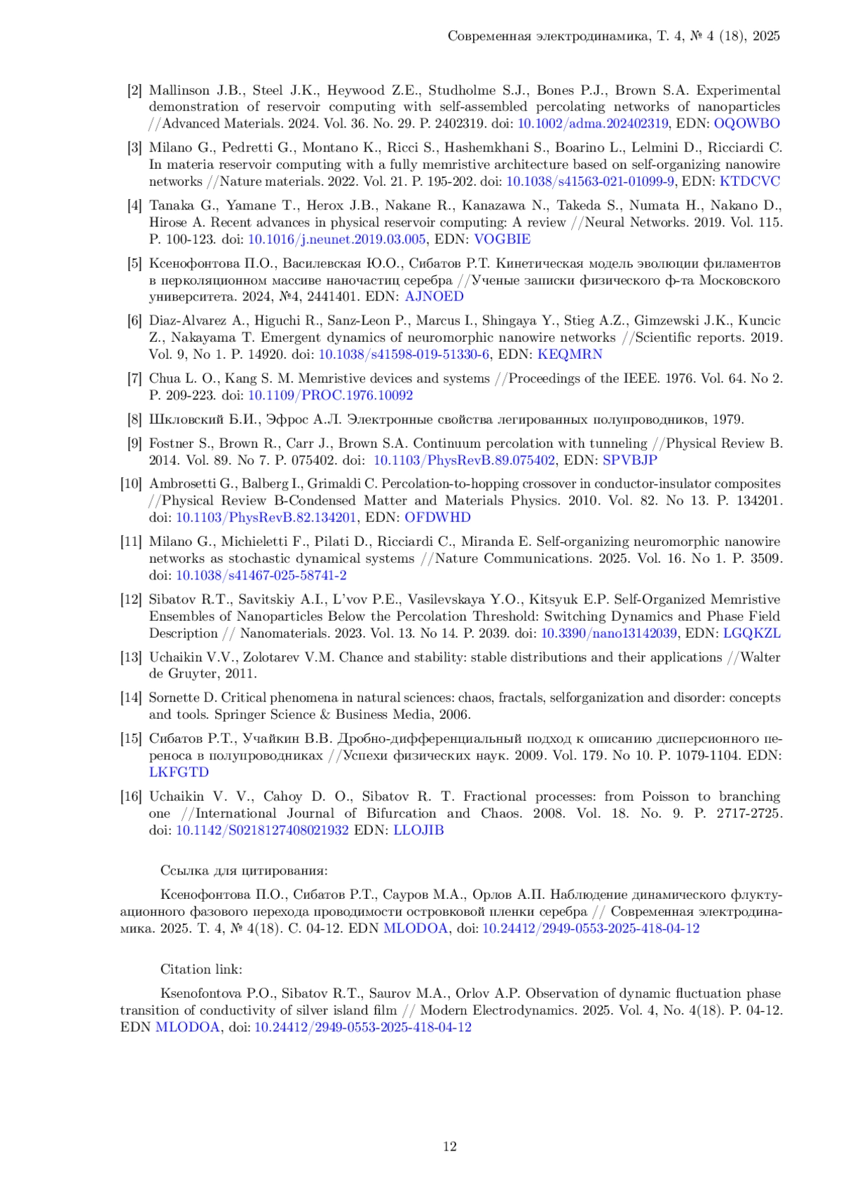 12. 	Sibatov R.T., Savitskiy A.I., L’vov P.E., Vasilevskaya Y.O., Kitsyuk E.P. Self-Organized Memristive Ensembles of Nanoparticles Below the Percolation Threshold: Switching Dynamics and Phase Field Description // Nanomaterials. 2023. Vol. 13. No 14. P. 2039. ,. DOI: 10.3390/nano13142039