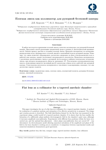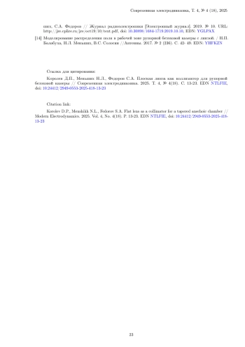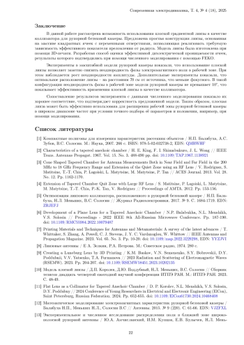 11. 	Flat Lens as a Collimator for Tapered Anechoic Chamber / D. P. Korolev, N.L. Menshikh, V.S. Solosin, D.Y. Poddubny // 2024 Conference of Young Researchers in Electrical and Electronic Engineering (ElCon), Saint Petersburg, Russian Federation. 2024. Pp. 652-655. DOI: 10.1109/ElCon61730.2024.10468408