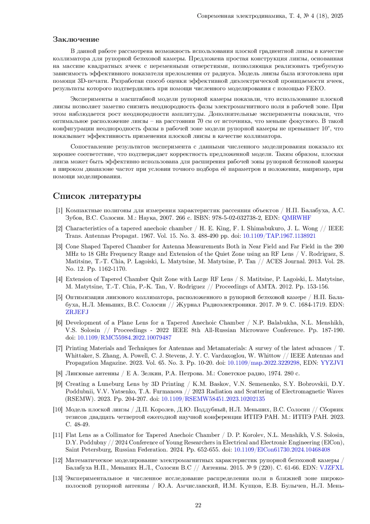 6. 	Development of a Plane Lens for a Tapered Anechoic Chamber / N.P. Balabukha, N.L. Menshikh, V.S. Solosin // Proceedings - 2022 IEEE 8th All-Russian Microwave Conference. Pp. 187-190. DOI: 10.1109/RMC55984.2022.10079487