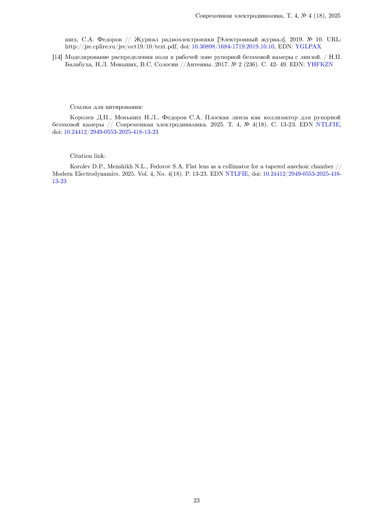13. 	Экспериментальное и численное исследование распределения поля в ближней зоне широкополосной рупорной антенны / Ю.А. Амчиславский, И.М. Купцов, Е.В. Булычев, Н.Л. Меньших, С.А. Федоров // Журнал радиоэлектроники [Электронный журнал]. 2019. № 10. URL: http://jre.cplire.ru/jre/oct19/10/text.pdf, ,. DOI: 10.30898/1684-1719.2019.10.10