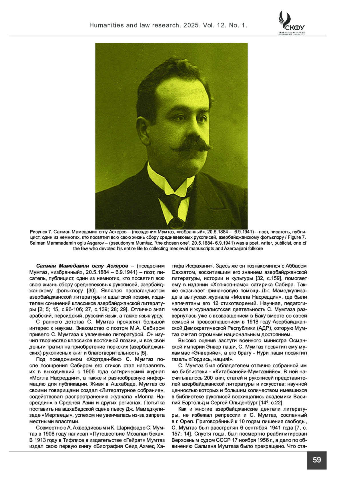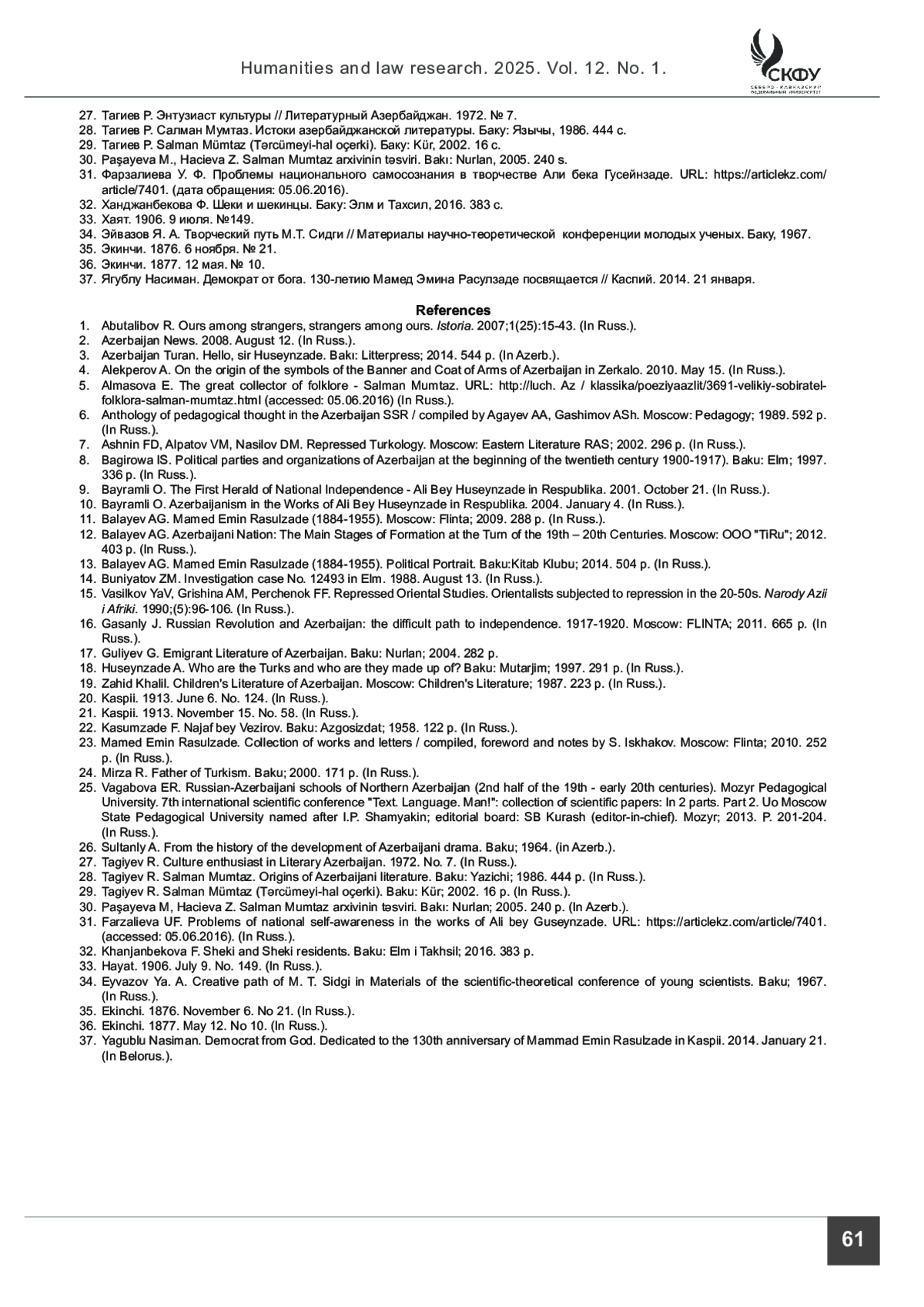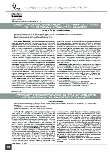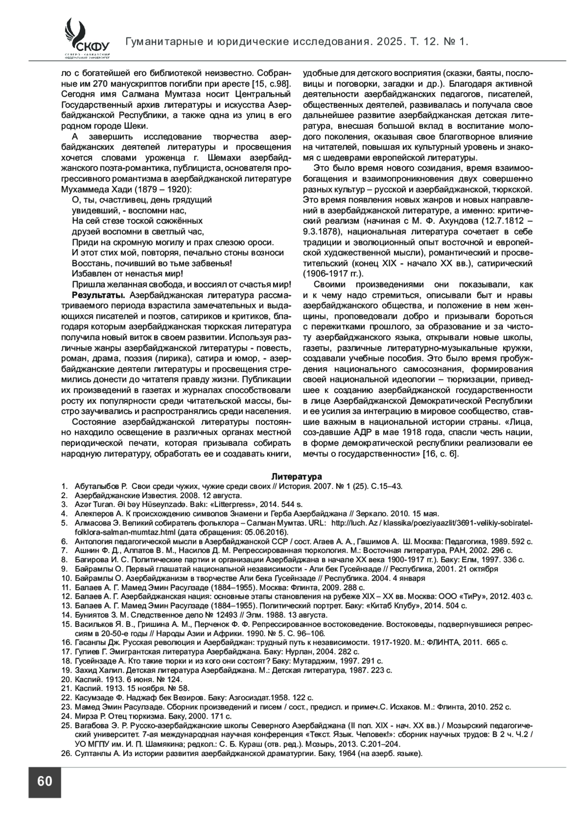 ВАГАБОВА Э. Р. ОСОБЕННОСТИ РАЗВИТИЯ АЗЕРБАЙДЖАНСКОЙ ЛИТЕРАТУРЫ И ПРОСВЕТИТЕЛЬСТВА ДО 1917 Г.: ПЕРСОНАЛИИ И ИСТОРИКО-КУЛЬТУРНЫЙ КОНТЕКСТ // ГУМАНИТАРНЫЕ И ЮРИДИЧЕСКИЕ ИССЛЕДОВАНИЯ. 2025. ТОМ 12, № 1