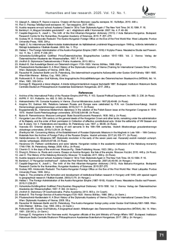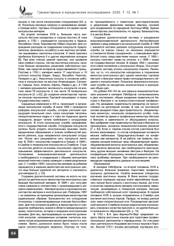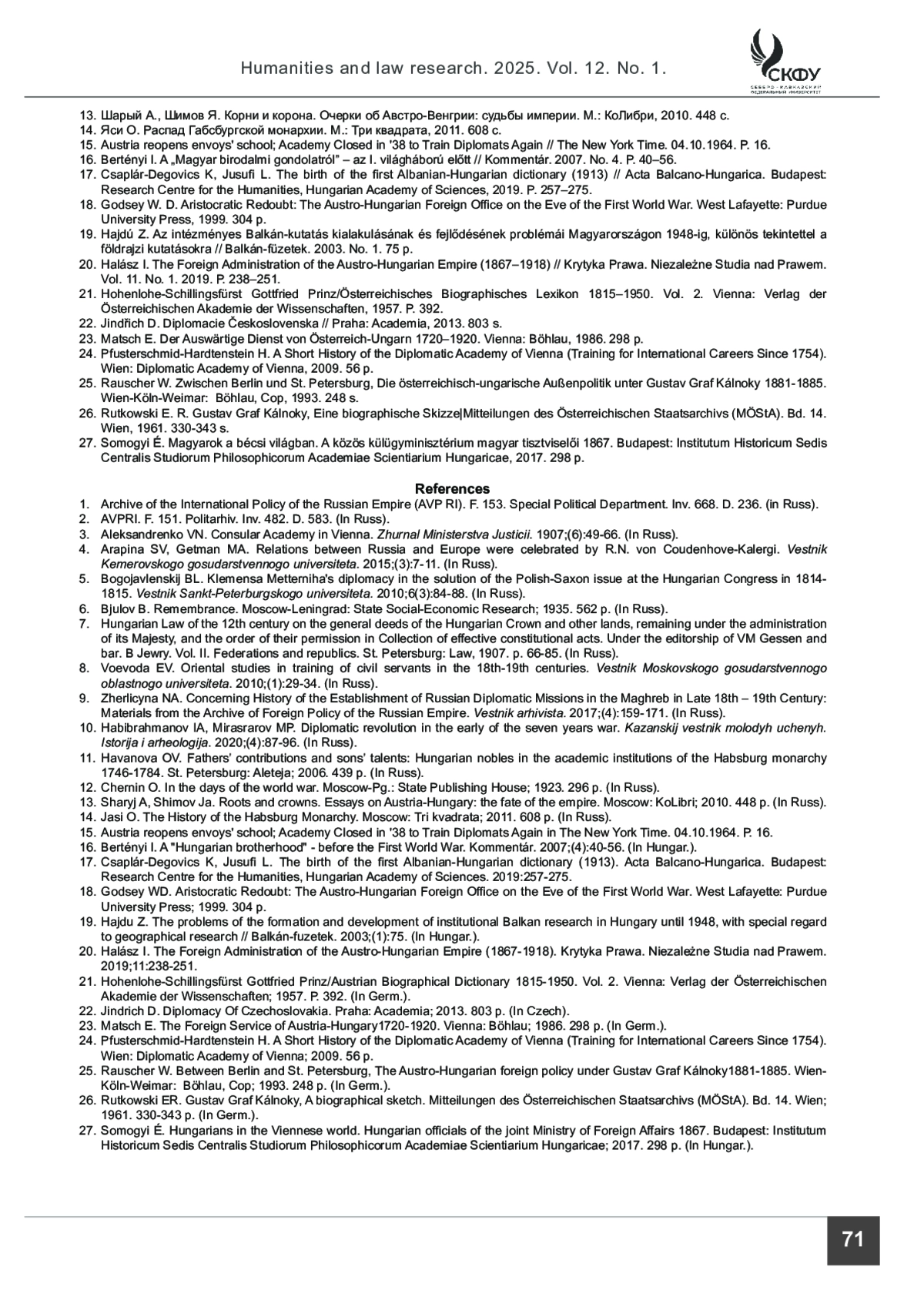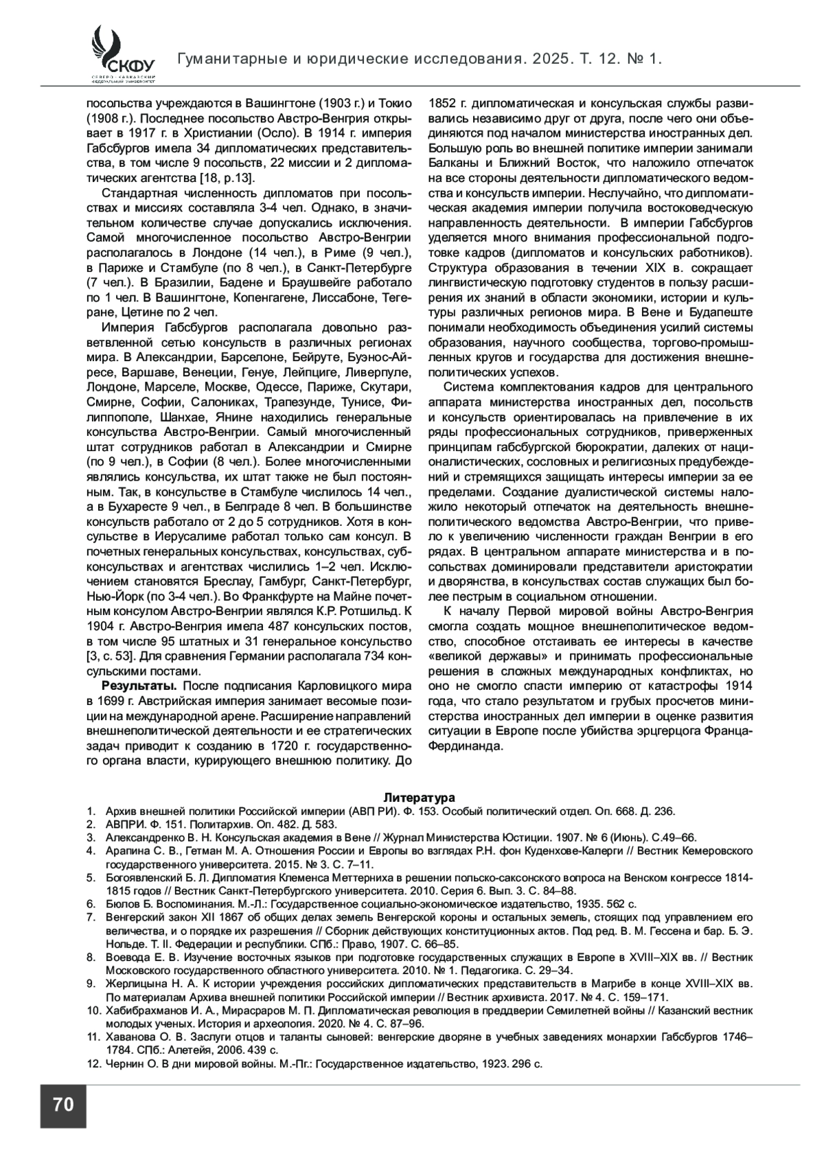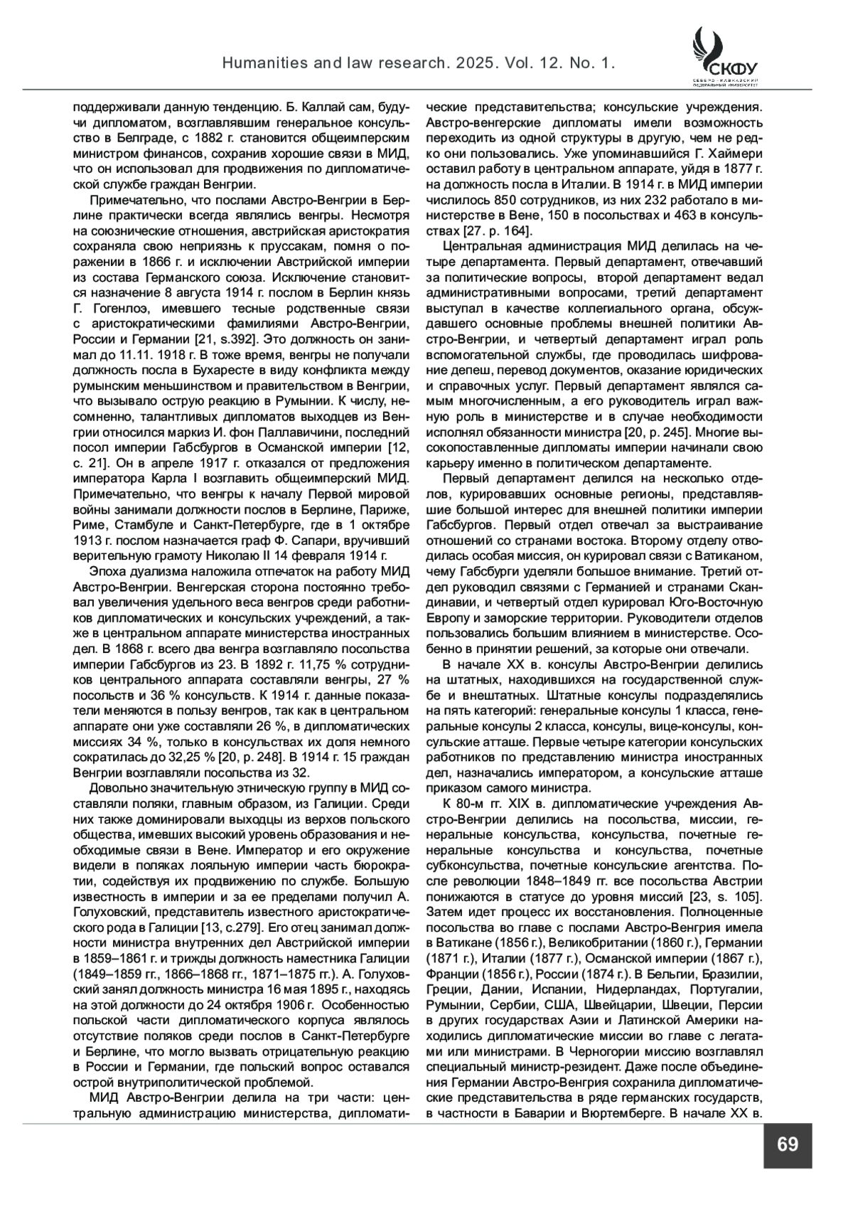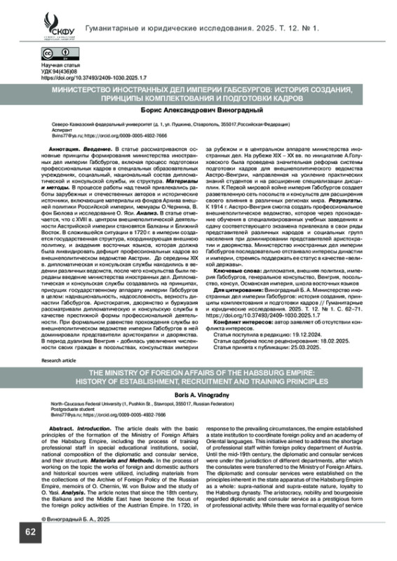 ВИНОГРАДНЫЙ Б. А. МИНИСТЕРСТВО ИНОСТРАННЫХ ДЕЛ ИМПЕРИИ ГАБСБУРГОВ: ИСТОРИЯ СОЗДАНИЯ, ПРИНЦИПЫ КОМПЛЕКТОВАНИЯ И ПОДГОТОВКИ КАДРОВ // ГУМАНИТАРНЫЕ И ЮРИДИЧЕСКИЕ ИССЛЕДОВАНИЯ. 2025. ТОМ 12, № 1