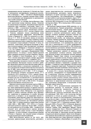 Анализ. В статье отмечается, что с XVIII в. центром внешнеполитической деятельности Австрийской империи становятся Балканы и Ближний Восток. В сложившейся ситуации в 1720 г. в империи создается государственная структура, координирующая внешнюю политику, и академия восточных языков, которая должна была ликвидировать дефицит профессиональных кадров во внешнеполитическом ведомстве Австрии. До середины XIX в. дипломатическая и консульская службы находились в ведении различных ведомств, после чего консульства были переданы введение министерства иностранных дел. Дипломатическая и консульская службы создавались на принципах, присущих государственному аппарату империи Габсбургов в целом: наднациональность, надсословность, верность династии Габсбургов. Аристократия, дворянство и буржуазия рассматривали дипломатическую и консульскую службы в качестве престижной формы профессиональной деятельности. При формальном равенстве прохождения службы во внешнеполитическом ведомстве империи Габсбургов в ней доминировали представители аристократии и дворянства. В период дуализма Венгрия добилась увеличения численности своих граждан в посольствах, консульствах империи за рубежом и в центральном аппарате министерства иностранных дел. На рубеже XIX – XX вв. по инициативе А. Голуховского была проведена значительная реформа системы подготовки кадров для внешнеполитического ведомства Австро-Венгрии, направленная на усиление практических знаний студентов и на расширение специализации дисциплин. К Первой мировой войне империя Габсбургов создает разветвленную сеть посольств и консульств для расширения своего влияния в различных регионах мира.