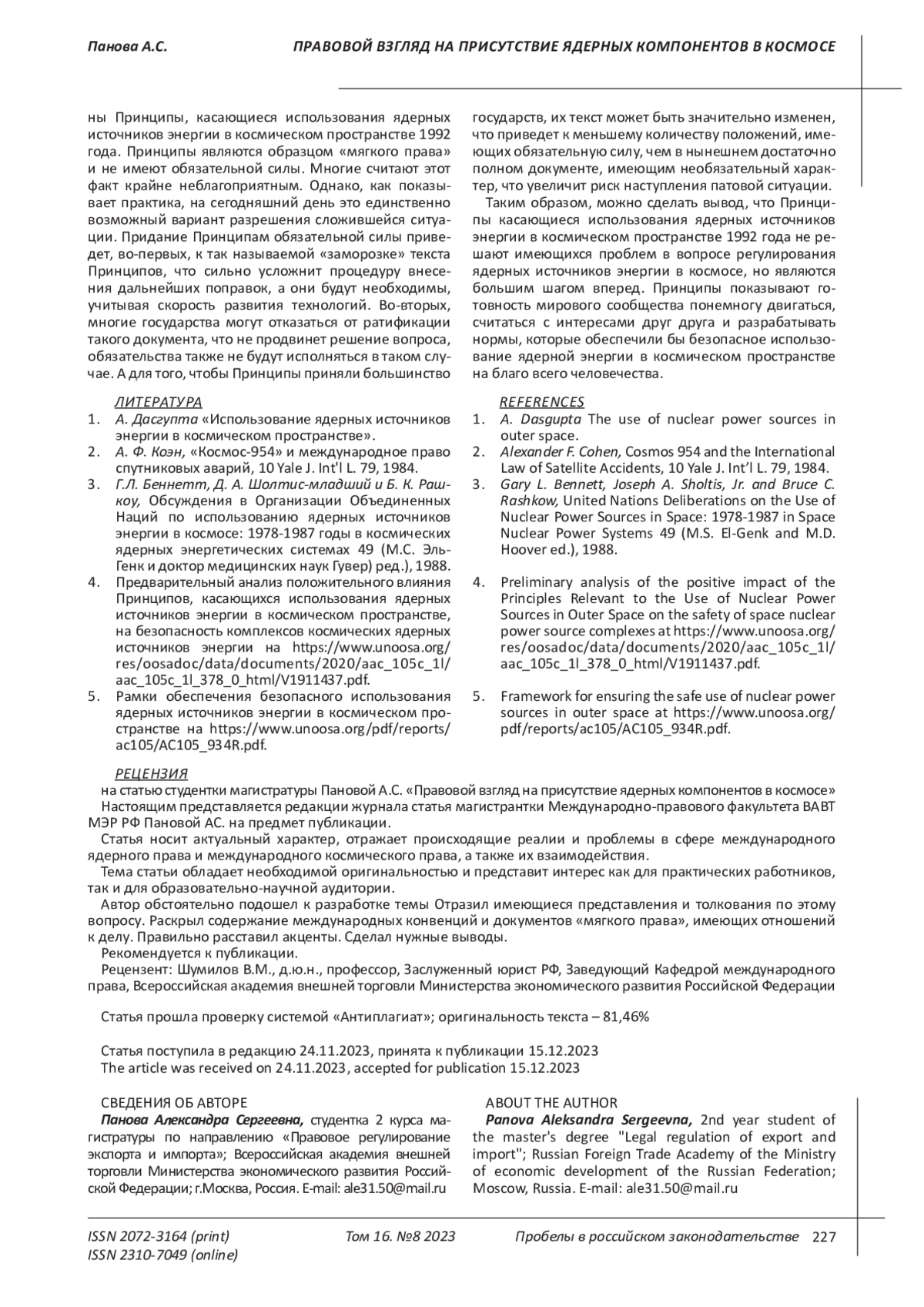 В данной статье исследуется правовое регулирование использования ядерной энергии в космическом пространстве, в частности, рассматривается вопрос использования ядерных источников энергии на космических объектах. Целью проведения такого исследования является анализ существующих норм международного права, регулирующих возможность применения ядерной энергии в космосе, а также выявление пробелов в таком регулировании. Кроме того, исследование направлено на более детальное изучение имеющихся норм «мягкого права», в частности, рассмотрены Принципы, касающиеся использования ядерных источников энергии в космическом пространстве 1992 года, которые являются практически единственным регулятором использования ядерных источников энергии в космическом пространстве. В статье приведён анализ основополагающих конвенций в области регулирования ядерной энергии в контексте ее применения в космосе, в основе которого лежит мнение компетентных исследователей международного ядерного права и международного космического права. Автор настоящей статьи проводит подробный анализ нормативно-правовой базы в области применения энергии ядра атома в космосе, а именно с помощью сравнительно-правового метода выявлены основополагающие нормы, идеи и достоинства, а также недостатки таких нормативно-правовых актов, как: Договор о принципах деятельности государств по исследованию и использованию космического пространства, включая Луну и другие небесные тела 1967 г., Конвенция об оперативном оповещении о ядерной аварии 1986 г., Конвенция о помощи в случае ядерной или радиационной аварийной ситуации 1986 г., Принципы, касающиеся использования ядерных источников энергии в космическом пространстве 1992 г. Автор приходит к выводу, что имеющееся нормативно-правовое регулирование использования ядерных источников энергии в космосе не является полным, всеобъемлющим и достаточным, однако отмечает, что шаги в направлении более качественного регулирования делаются, что уже является хорошей тенденцией и свидетельствует об огромном объеме проделанной работы. В данной статье отражён собственный анализ актуальных положений международных договоров, а также документов «мягкого права» для более полного выявления сути исследуемых вопросов.