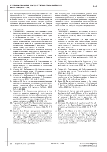 5. 	Покида А.Н., Зыбуновская Н.В. Регулирование деятельности самозанятых граждан // Вопросы государственного и муниципального управления. 2020. № 1. C. 60-85. EDN: PAXTQP