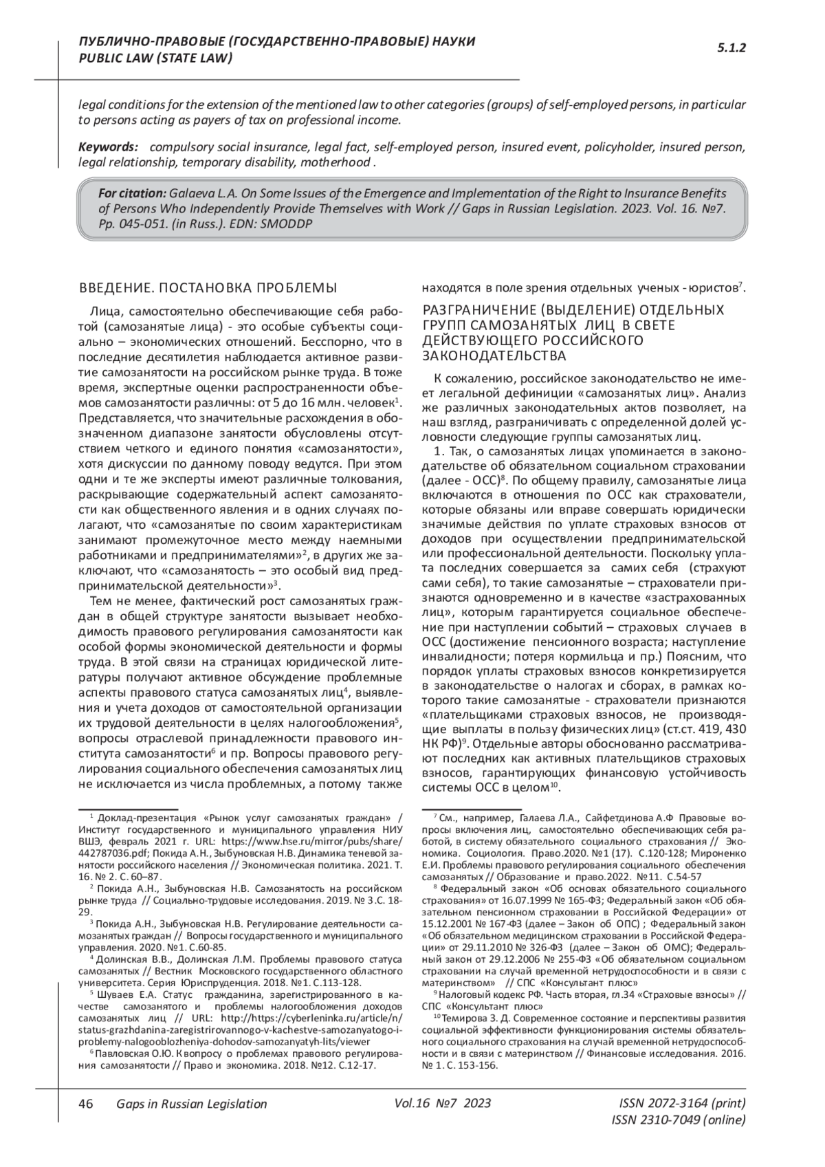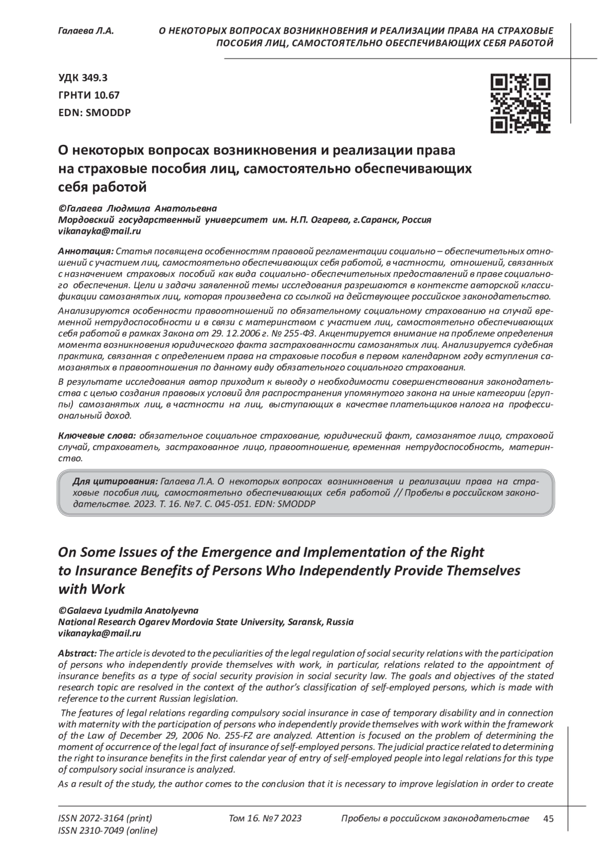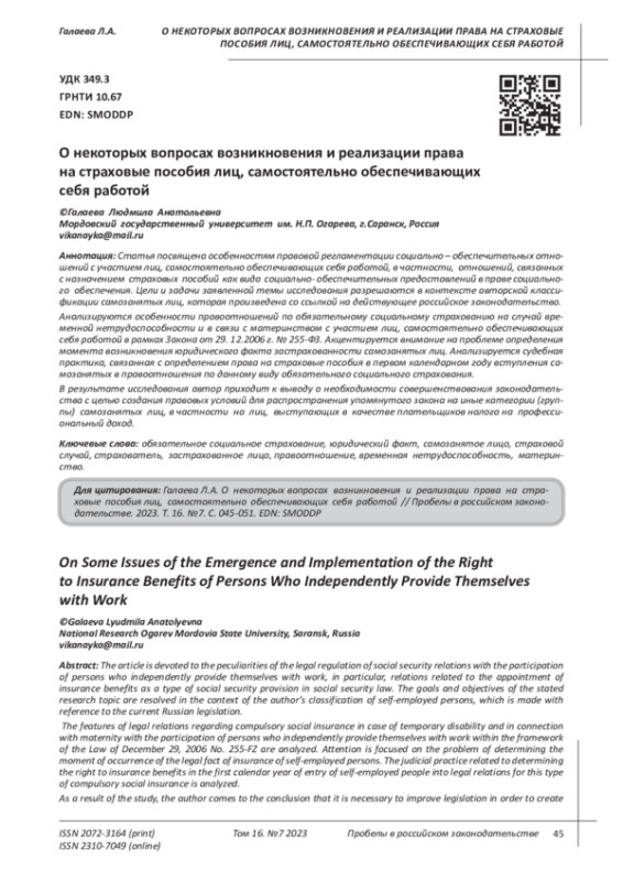 2. 	Галаева Л.А., Сайфетдинова А.Ф Правовые вопросы включения лиц, самостоятельно обеспечивающих себя работой, в систему обязательного социального страхования // Экономика. Социология. Право. 2020. №1 (17). С.120-128. EDN: SDXOUC