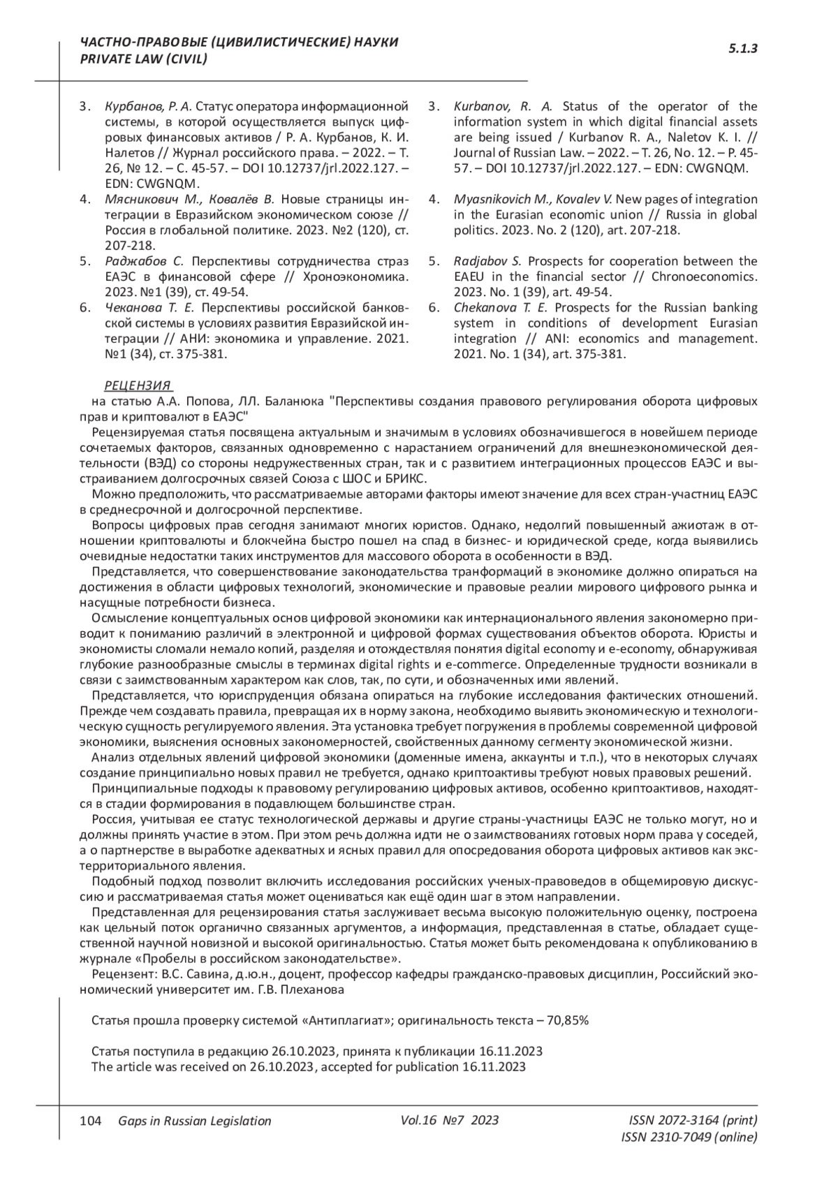 3. 	Курбанов, Р. А. Статус оператора информационной системы, в которой осуществляется выпуск цифровых финансовых активов / Р. А. Курбанов, К. И. Налетов // Журнал российского права. - 2022. - Т. 26, № 12. - С. 45-57. -. DOI: 10.12737/jrl.2022.127 EDN: CWGNQM