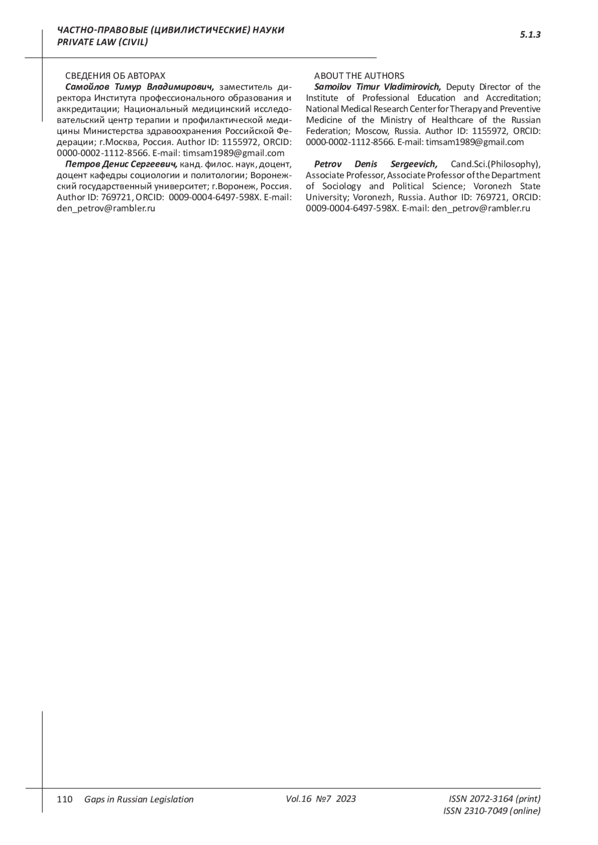 6. 	Самойлов Т.В., Петров Д.С. Роль семьи в охране интересов лица, совершившего попытку суицида: правовые последствия материального характера. // Государственная служба и кадры. - 2023. - № 3. - С. 180-183. EDN: QFUMPO