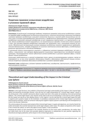В юридической литературе проблемы теоретико-правового осмысления воздействия в уголовно-правовой сфере приобретают все большую актуальность, поскольку отсутствие легального толкования «уголовно-правового воздействия» вызывает множество дискуссии в научной среде относительно его места и роли в системе противодействия преступности и профилактике правонарушений. Уголовно-правовое воздействие выступает реакцией государства на акт совершения преступления и на преступность в целом, однако воздействие может оказываться и на законопослушных граждан. В этой связи можно говорить о том, что уголовно-правовое воздействие оказывает как негативное, так и позитивное влияние на личность. Обязательной составляющей уголовно-правового воздействия является профилактико-предупредительная деятельность, которая направлена на снижение негативного влияния факторов, способствующих развитию преступности в Российской Федерации. В настоящей статье анализируются сущность и содержание уголовно-правового воздействия, его цели и задачи, в результате чего автором формулируются сущностные характеристики исследуемой правовой категории. Рассматривается также субъектный состав воздействия в уголовно-правовой сфере, а также объект такого воздействия. Анализируя представленные в научной литературе точки зрения на рассматриваемые вопросы, автор не опровергает их, но при этом приводит объективные доводы в обоснование собственной позиции относительно теоретико-правового обоснования воздействия в уголовно-правовой сфере.