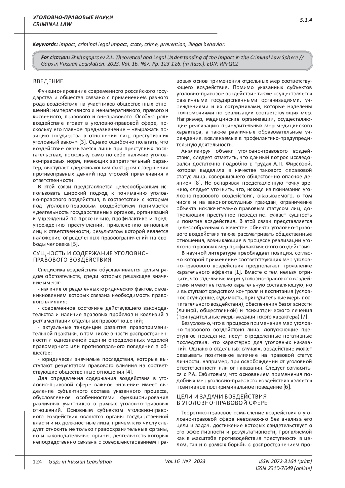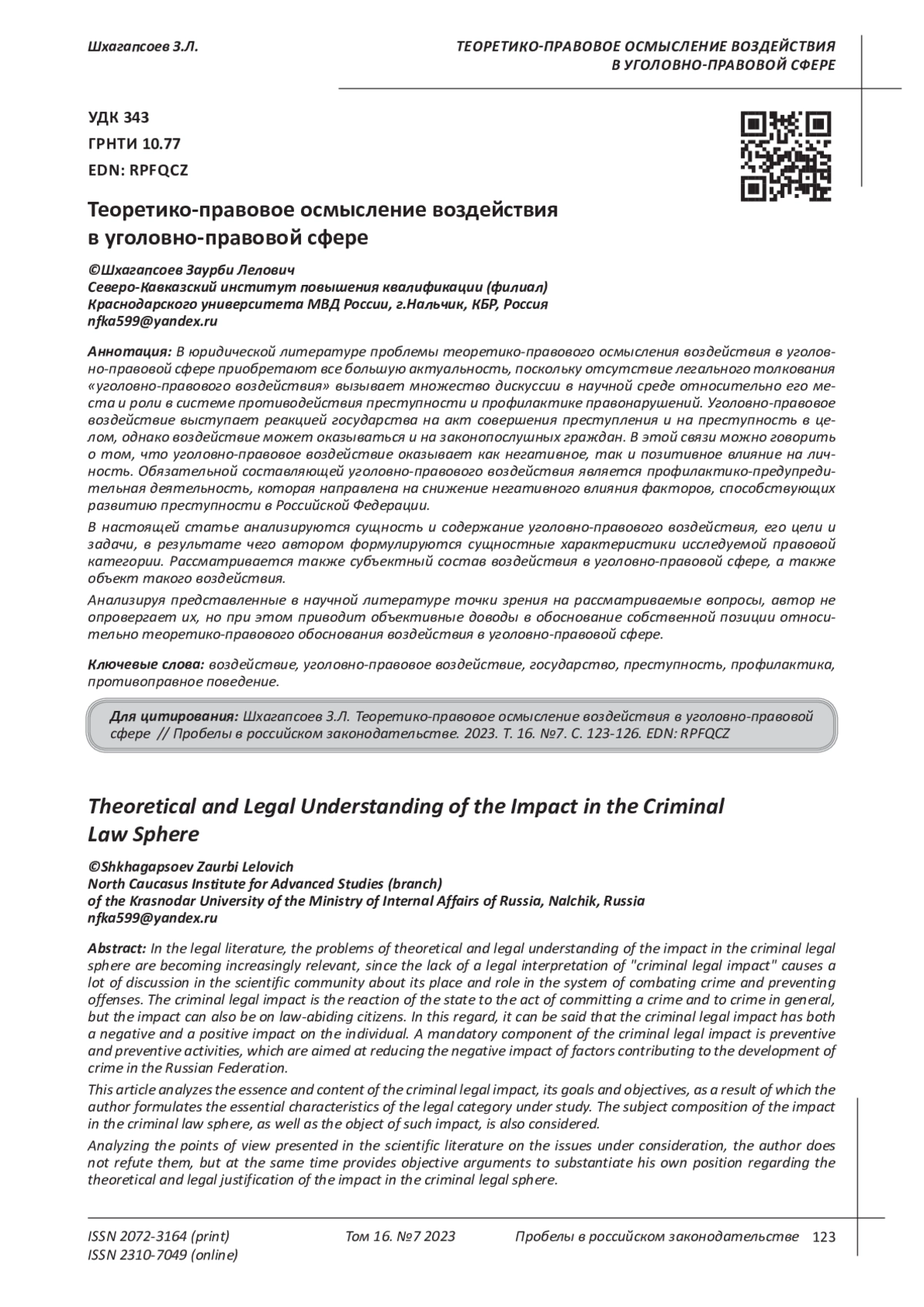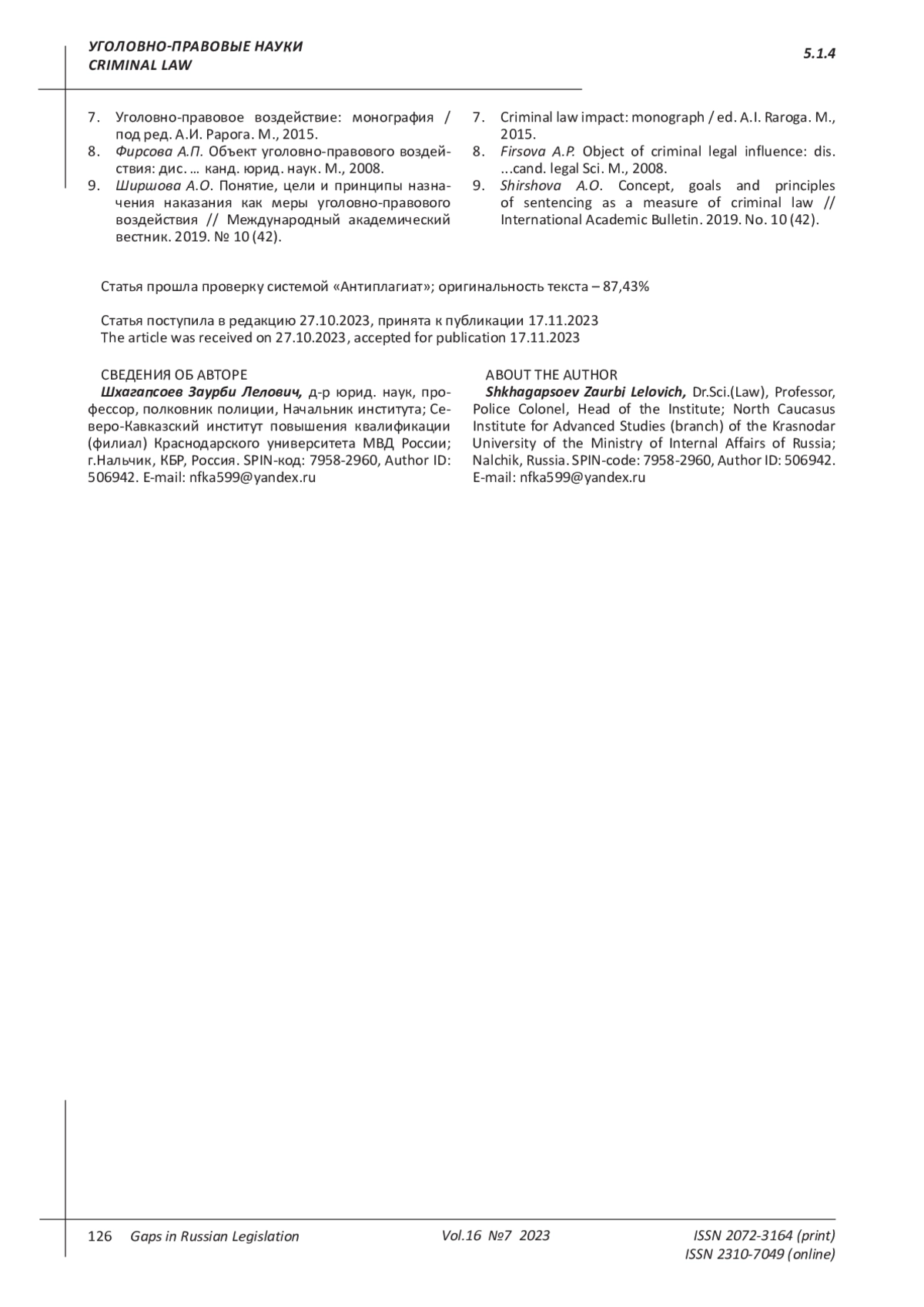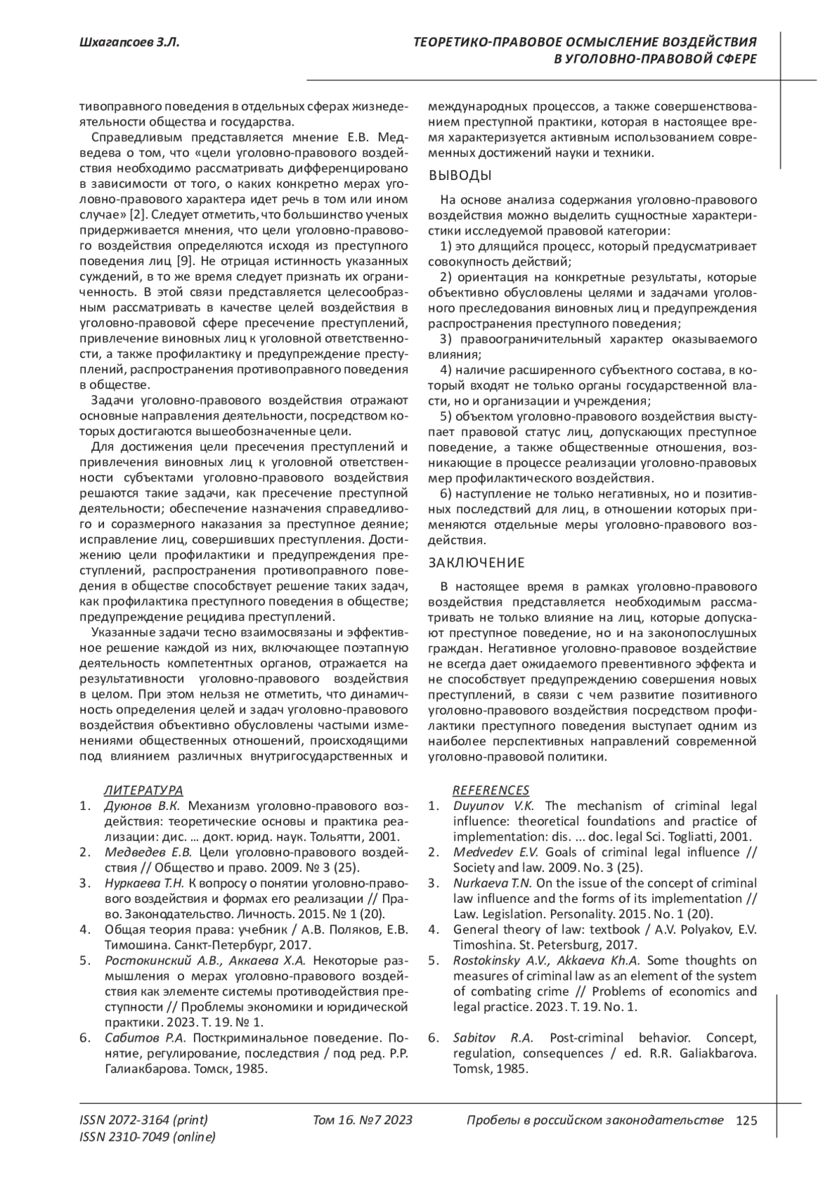 5. 	Ростокинский А.В., Аккаева Х.А. Некоторые размышления о мерах уголовно-правового воздействия как элементе системы противодействия преступности // Проблемы экономики и юридической практики. 2023. Т. 19. № 1. EDN: ZQDEPR