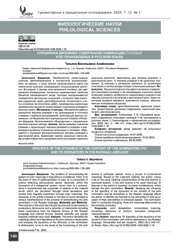 Введение. Проблематика семантизации системы цветообозначений в лингвистике рассматривается, во-первых, с точки зрения систематизации цвета как компонента культуры, отражающего этнокультурные ценности. Во-вторых, в рамках категориальной системы, где цвет является универсумом, поскольку характеризует свойства объектов материального мира, которые воспринимаются посредством зрительных ощущений и получают свое языковое выражение через цветообозначения. Актуальность статьи основана на отсутствии работ, посвященных различным проявлениям процесса семантизации номинации розовый в русском языке.