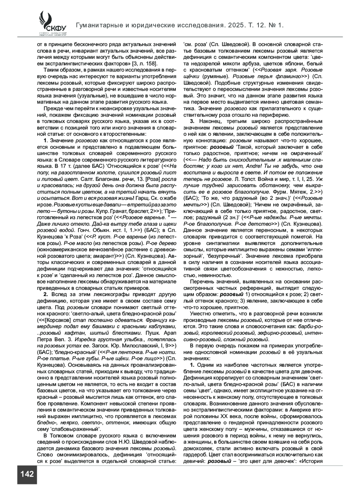Анализ. Автор выявляет значения (прямые и переносные) лексемы розовый в словарях и анализирует динамику отражения номинации в словарях, обращается к изучению функционирования лексемы розовый в разговорной речи, формирует корпус узуальных значений. На основе собранного материала автор составляет перечень Research article узуальных значений, характерных для лексемы розовый, в разговорной речи: 1) лексема розовый в её узуальных значениях; 2) лексемы в авторском значении; 3) устойчивые сочетания, в состав которых входит номинация розовый.