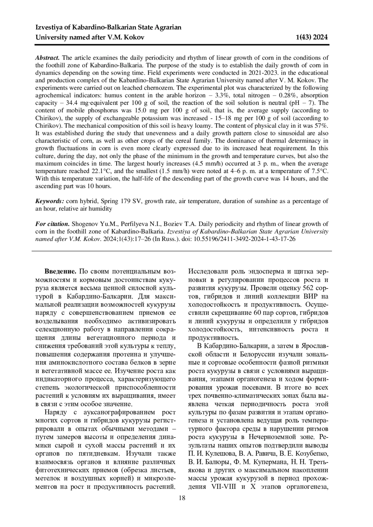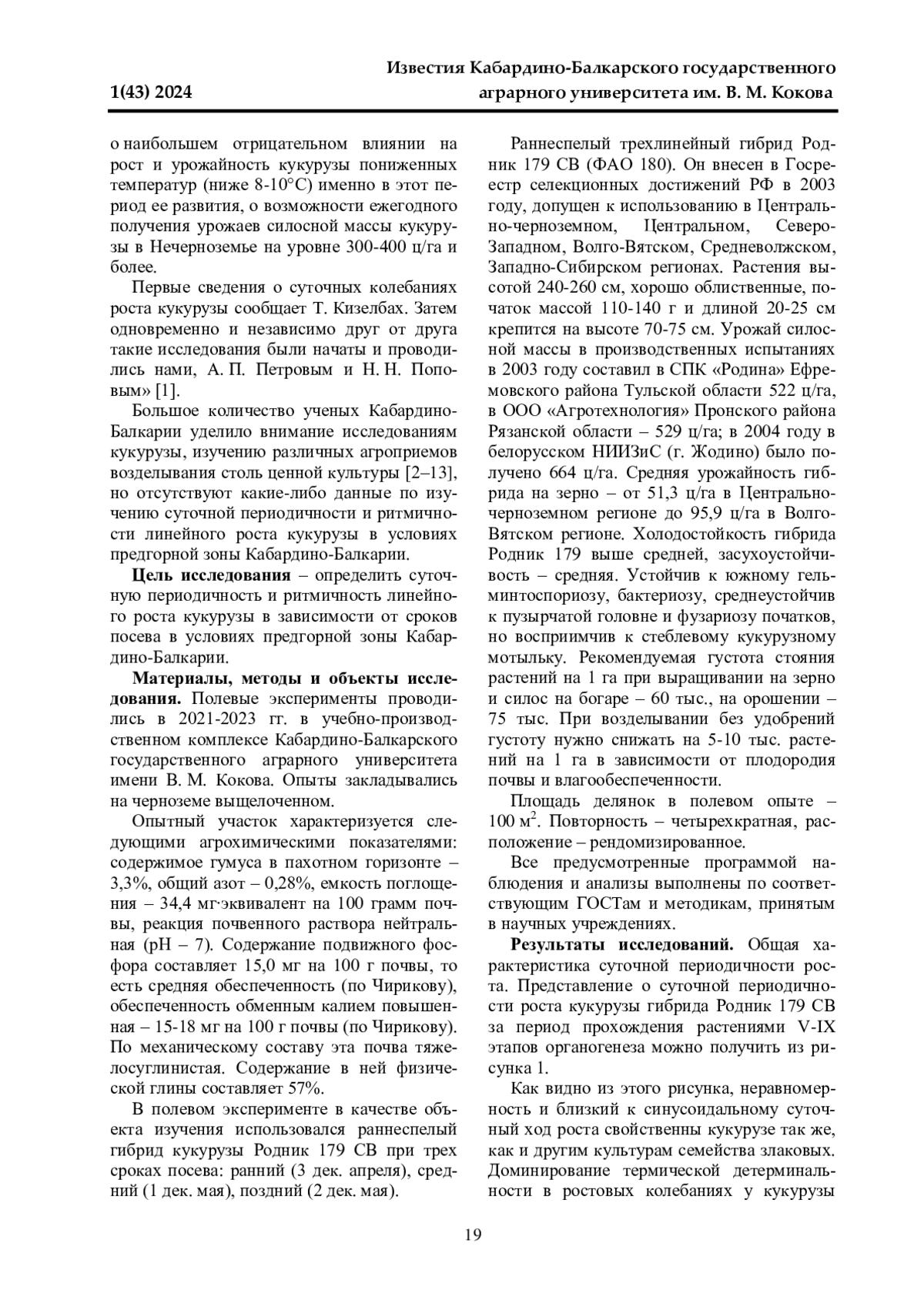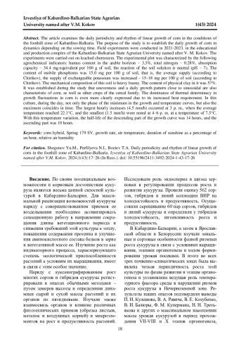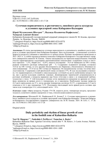 В статье рассматривается суточная периодичность и ритмичность линейного роста кукурузы в условиях предгорной зоны Кабардино-Балкарии. Цель исследования - установление суточного прироста кукурузы в динамике в зависимости от сроков посева. Полевые эксперименты проводились в 2021-2023 гг. в учебно-производственном комплексе Кабардино-Балкарского государственного аграрного университета имени В. М. Кокова. Опыты закладывались на черноземе выщелоченном. Опытный участок характеризовался следующими агрохимическими показателями: содержимое гумуса в пахотном горизонте - 3,3%, общий азот - 0,28%, емкость поглощения - 34,4 мг∙эквивалент на 100 г почвы, реакция почвенного раствора нейтральная (рН - 7). Содержание подвижного фосфора составляло 15,0 мг на 100 г почвы, то есть средняя обеспеченность (по Чирикову), обеспеченность обменным калием повышенная - 15-18 мг на 100 г почвы (по Чирикову). По механическому составу эта почва тяжелосуглинистая. Содержание в ней физической глины составляло 57%. В ходе исследования установлено, что неравномерность и близкий к синусоидальному суточный ход роста свойственны кукурузе так же, как и другим культурам семейства злаковых. Доминирование термической детерминальности в ростовых колебаниях у кукурузы выражено еще более отчетливо в связи с ее повышенной требовательностью к теплу. У этой культуры в течение суток проявляется совпадение во времени не только фазы минимума на кривых роста и температуры, но и максимума. Наибольшие часовые приросты (4,5 мм/ч) приходились на 15 ч, когда средняя температура достигала 22,1°С, а наименьшие (1,5 мм/ч) отмечены в 4-6 ч при температуре 7,5°С. Полупериод нисходящей части кривой роста составил при таком ходе температуры 14 ч, а восходящей части - 10 ч.