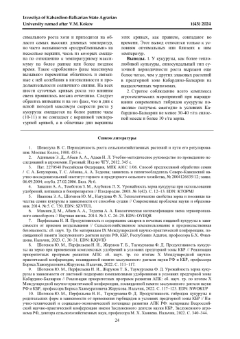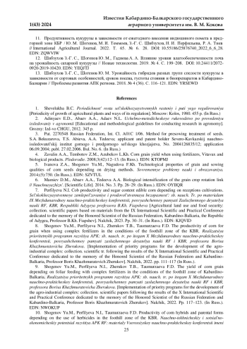 11. 	Продуктивность кукурузы в зависимости от ежегодного внесения индюшиного помета в предгорной зоне КБР / Ю. М. Шогенов, М. И. Теммоев, З.-Г. С. Шибзухов, Н. И. Перфильева, Р. А. Тиев // International Agricultural Journal. 2022. Т. 65. № 6. 28. DOI: 10.55186/25876740_2022_6_6_28 EDN: ZQWVIW