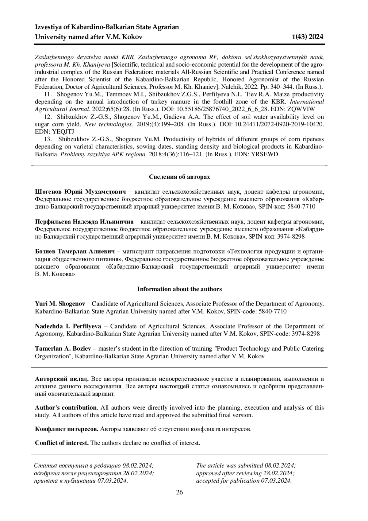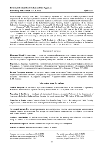 13. 	Шибзухов З.-Г. С., Шогенов Ю. М. Урожайность гибридов разных групп спелости кукурузы в зависимости от сортовых особенностей, сроков посева, густоты стояния и биопрепаратов в КабардиноБалкарии // Проблемы развития АПК региона. 2018. № 4 (36). С. 116-121. EDN: YRSEWD