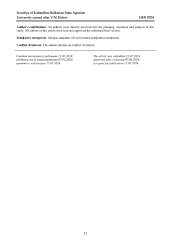 Данная работа посвящена выявлению изменений физико-химических показателей полуфабрикатов и ликероводочных изделий при обработке их холодом и оклеивающими веществами. Исследования проводились в условиях ООО «Эльбрус Спиритс» и на кафедре «Технология производства и переработки сельскохозяйственной продукции» Кабардино-Балкарского ГАУ в 2021-2023 гг. В качестве объектов исследований служили морсы и соки, выработанные из рябины, яблок и брусники. Спиртованные плодово-ягодные морсы и соки обрабатывали холодом при температурах: минус 3 + минус 6°С. Пробная обработка спиртованных соков показала, что оптимальная доза поливинилпирролидона (ПВП) для рябинового и брусничного соков составляет 200 мг/л, яблочного - 20 мг/л. Установлено, что при обработке ПВП и бентонитом значительно снижается количество фенольных веществ сока. При обработке спиртованных соков по данной схеме не наблюдалось заметного изменения содержания пектиновых веществ. Для предупреждения коллоидных помутнений рекомендованы следующие виды обработок: обработка холодом, заключающаяся в охлаждении полуфабрикатов или купажа до температуры (минус 3 + минус 6°С) и выдержка при этой температуре до 48 ч с последующей фильтрацией на холоду; обработка ПВП и бентонитом, для полуфабрикатов доза не превышает 200 мг/л, купажа - 100 мг/л. Количество бентонита, применяемого при этом, - 0,5-1,0 г/л. Отмечено, что наблюдается прямая пропорциональность между количеством добавленного желатина и деленных фенольных веществ, максимальное содержание полифенолов, связанных единицей желатина, при минимальной дозе оклеивающего материала. Наблюдение за стабильностью обработанного напитка показало, что оптимальная доза желатина 50 мг/л. При обработке указанной дозой в сочетании с 0,5 г/л бентонита напиток сохраняет товарный вид в течение 8 месяцев, контрольный образец - 2 месяцев.