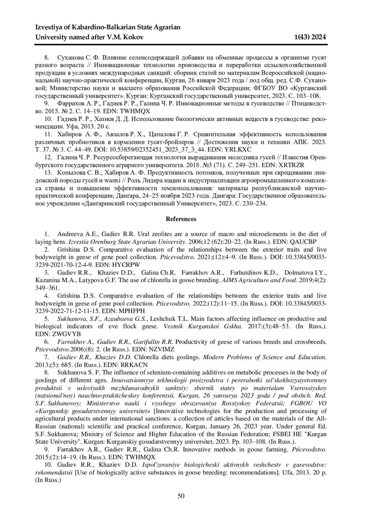 9. Фаррахов А. Р., Гадиев Р. Р., Галина Ч. Р. Инновационные методы в гусеводстве // Птицеводство. 2015. № 2. С. 14-19. EDN: TWHMQX
