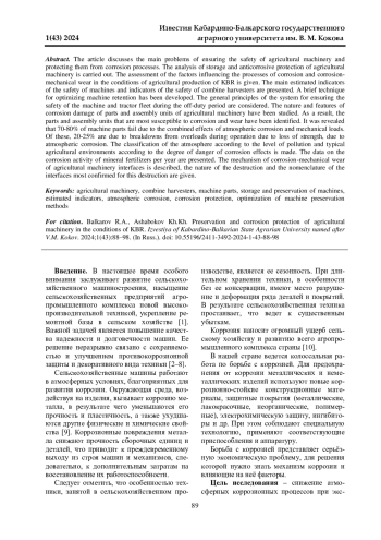 БАЛКАРОВ Р. А., АШАБОКОВ Х. Х. СОХРАНЯЕМОСТЬ И ЗАЩИТА ОТ КОРРОЗИИ СЕЛЬСКОХОЗЯЙСТВЕННОЙ ТЕХНИКИ В УСЛОВИЯХ КБР // ИЗВЕСТИЯ КАБАРДИНО-БАЛКАРСКОГО ГОСУДАРСТВЕННОГО АГРАРНОГО УНИВЕРСИТЕТА ИМ. В. М. КОКОВА. 2024. № 1 (43)