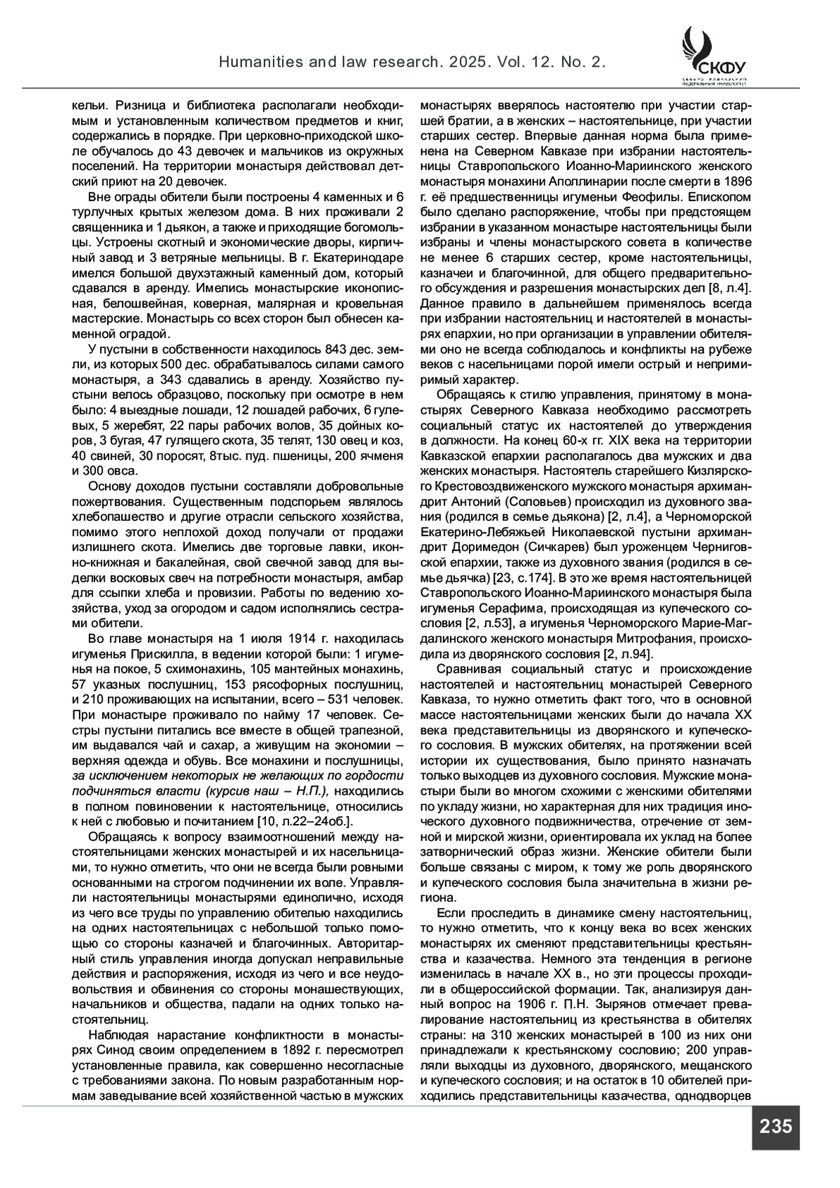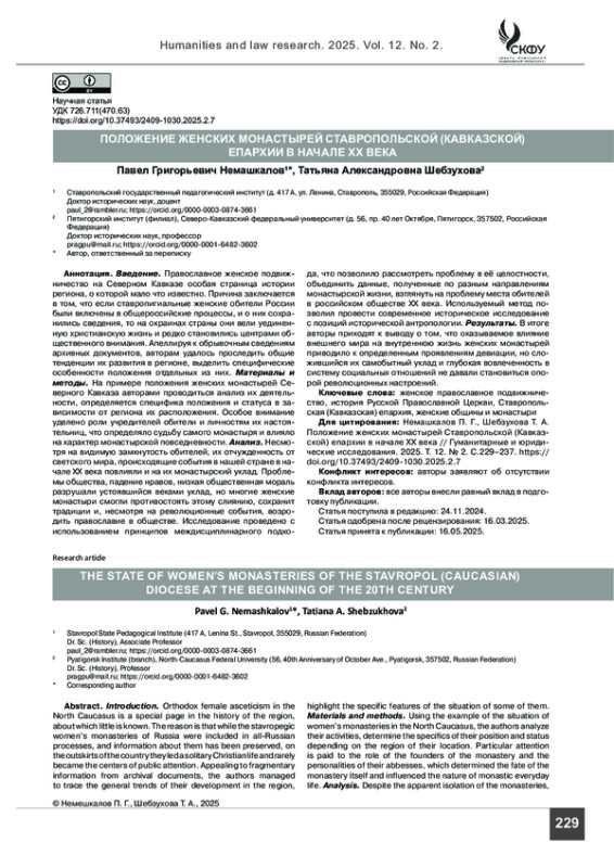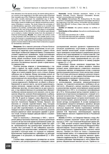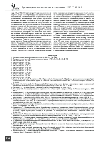 Введение. Православное женское подвижничество на Северном Кавказе особая страница истории региона, о которой мало что известно. Причина заключается в том, что если ставропигиальные женские обители России были включены в общероссийские процессы, и о них сохранились сведения, то на окраинах страны они вели уединенную христианскую жизнь и редко становились центрами общественного внимания. Апеллируя к обрывочным сведениям архивных документов, авторам удалось проследить общие тенденции их развития в регионе, выделить специфические особенности положения отдельных из них.