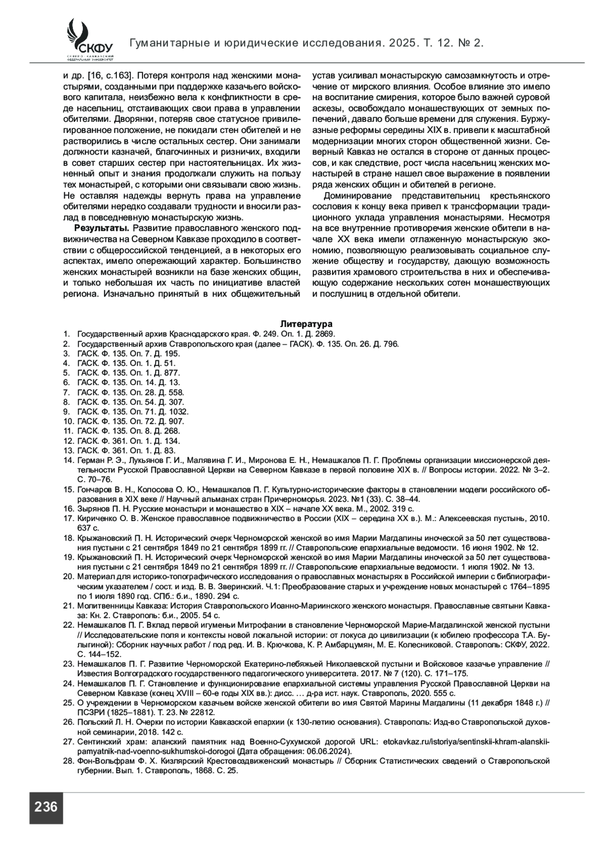 24. Немашкалов П. Г. Становление и функционирование епархиальной системы управления Русской Православной Церкви на Северном Кавказе (конец XVIII - 60-е годы XIX вв.): дисс. … д-ра ист. наук. Ставрополь, 2020. 555 с.