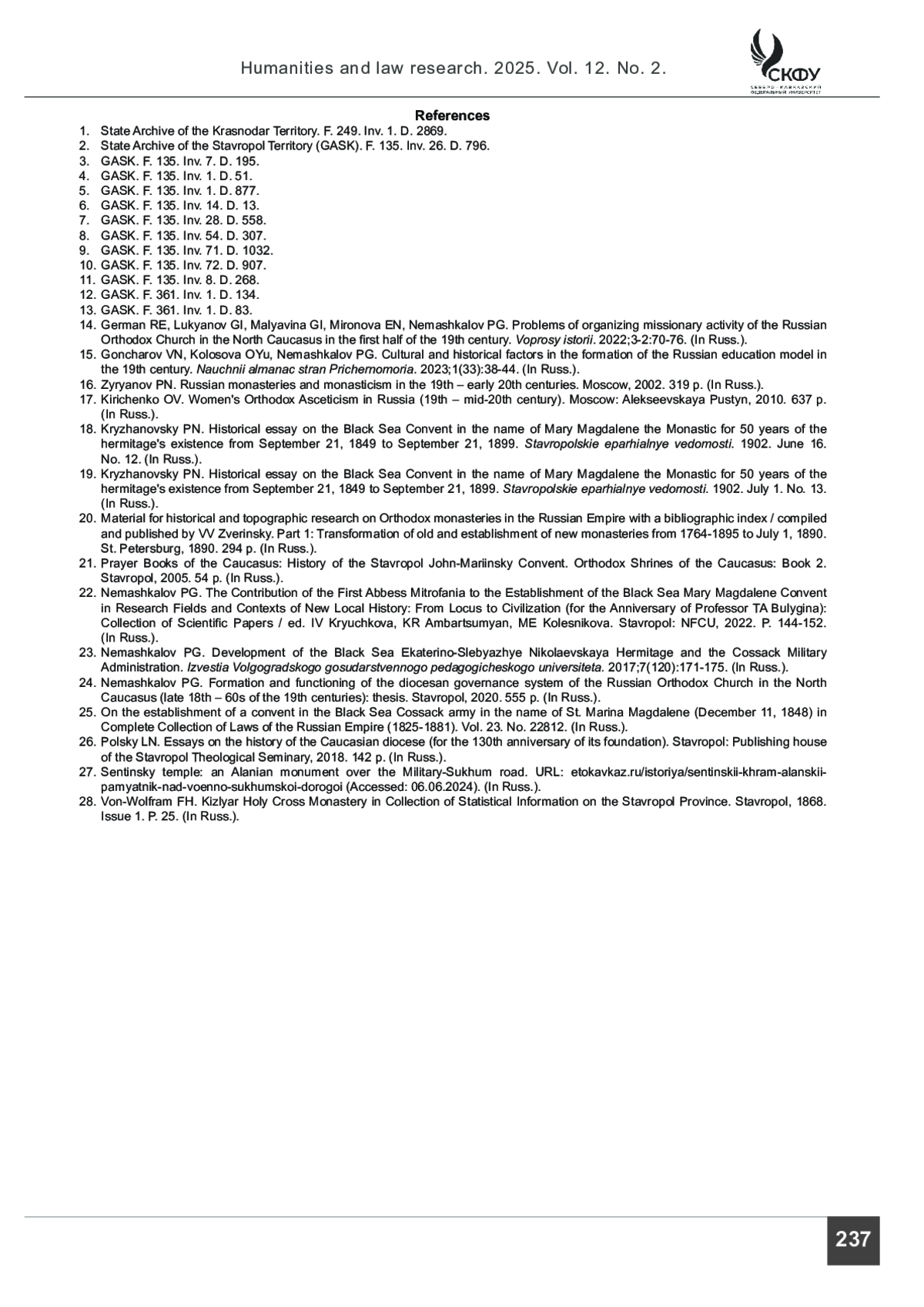 22. Немашкалов П. Г. Вклад первой игуменьи Митрофании в становление Черноморской Марие-Магдалинской женской пустыни // Исследовательские поля и контексты новой локальной истории: от локуса до цивилизации (к юбилею профессора Т.А. Булыгиной): Сборник научных работ / под ред. И. В. Крючкова, К. Р. Амбарцумян, М. Е. Колесниковой. Ставрополь: СКФУ, 2022. С. 144-152.