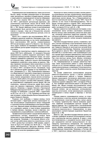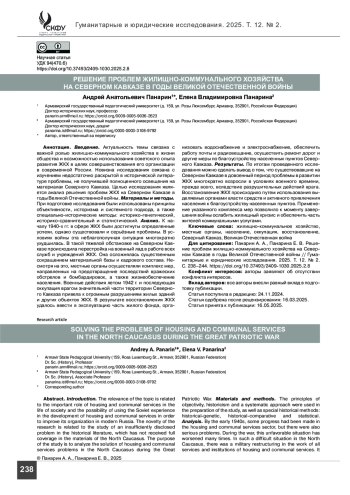 ПАНАРИН А. А., ПАНАРИНА Е. В. РЕШЕНИЕ ПРОБЛЕМ ЖИЛИЩНО-КОММУНАЛЬНОГО ХОЗЯЙСТВА НА СЕВЕРНОМ КАВКАЗЕ В ГОДЫ ВЕЛИКОЙ ОТЕЧЕСТВЕННОЙ ВОЙНЫ // ГУМАНИТАРНЫЕ И ЮРИДИЧЕСКИЕ ИССЛЕДОВАНИЯ. 2025. ТОМ 12, № 2