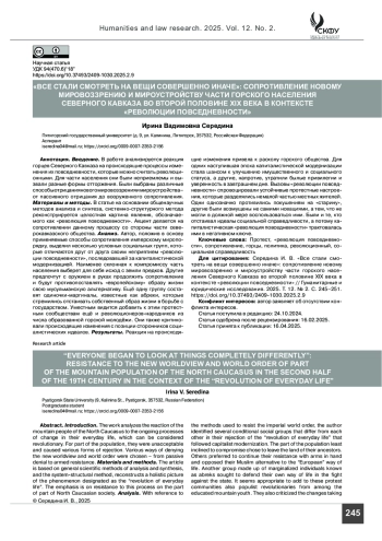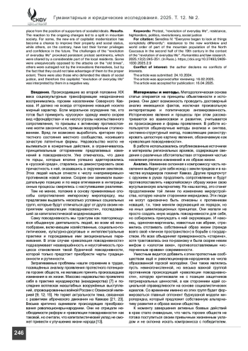 Введение. В работе анализируется реакция горцев Северного Кавказа на происходящие процессы изменения их повседневности, которые можно считать революционными. Для части населения они были неприемлемы и вызвали разные формы отторжения. Были выбраны различные способы отрицания нового мировоззрения и мироустройства– от пассивного отрицания до вооруженного сопротивления.