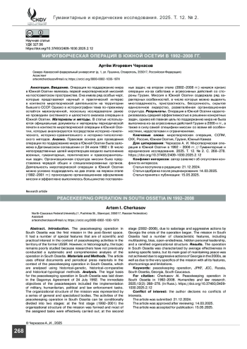 Введение. Операция по поддержанию мира в Южной Осетии являлась первой миротворческой миссией на постсоветском пространстве. Она имела ряд особых черт, которые представляют научный и практический интерес в контексте миротворческой деятельности на территории бывшего СССР. Однако в историографии тема по-прежнему остаётся малоизученной, поскольку исследователи ранее не проводили системного и целостного анализа операции в Южной Осетии.