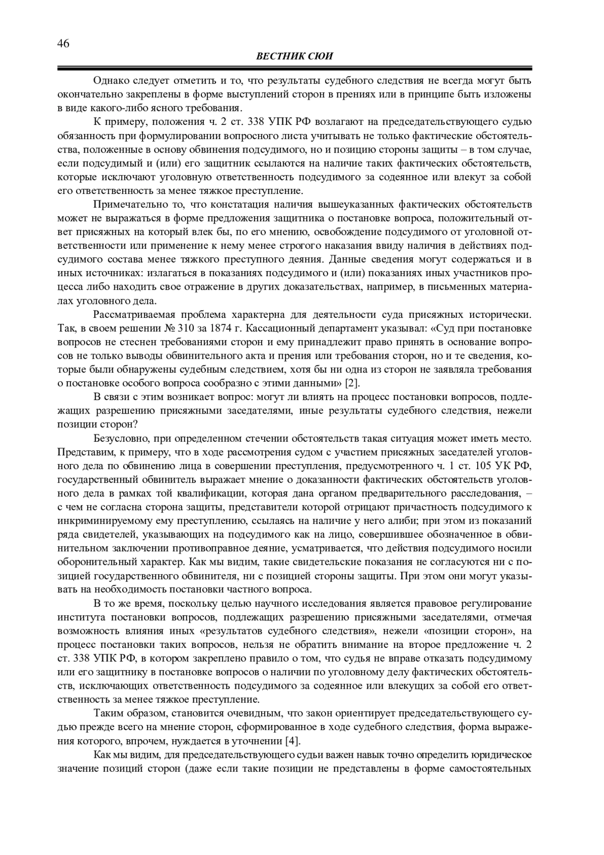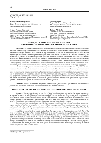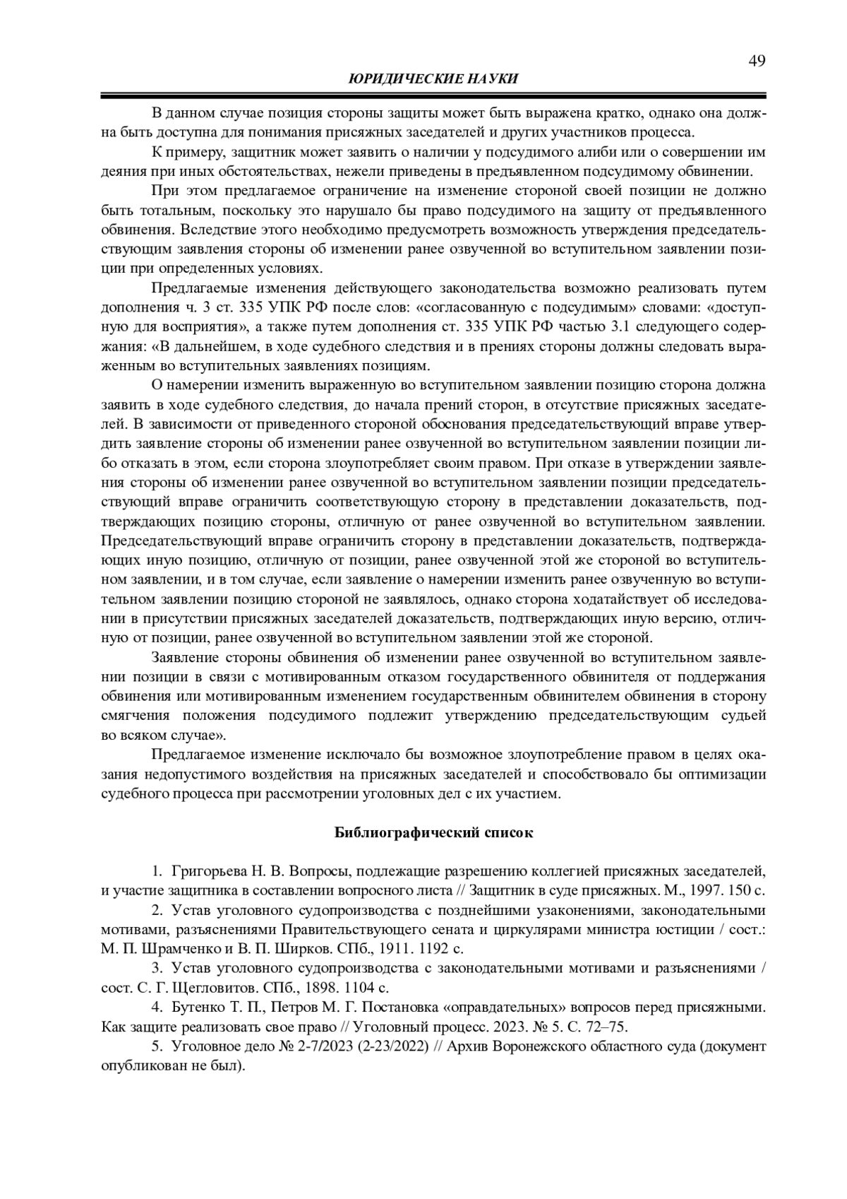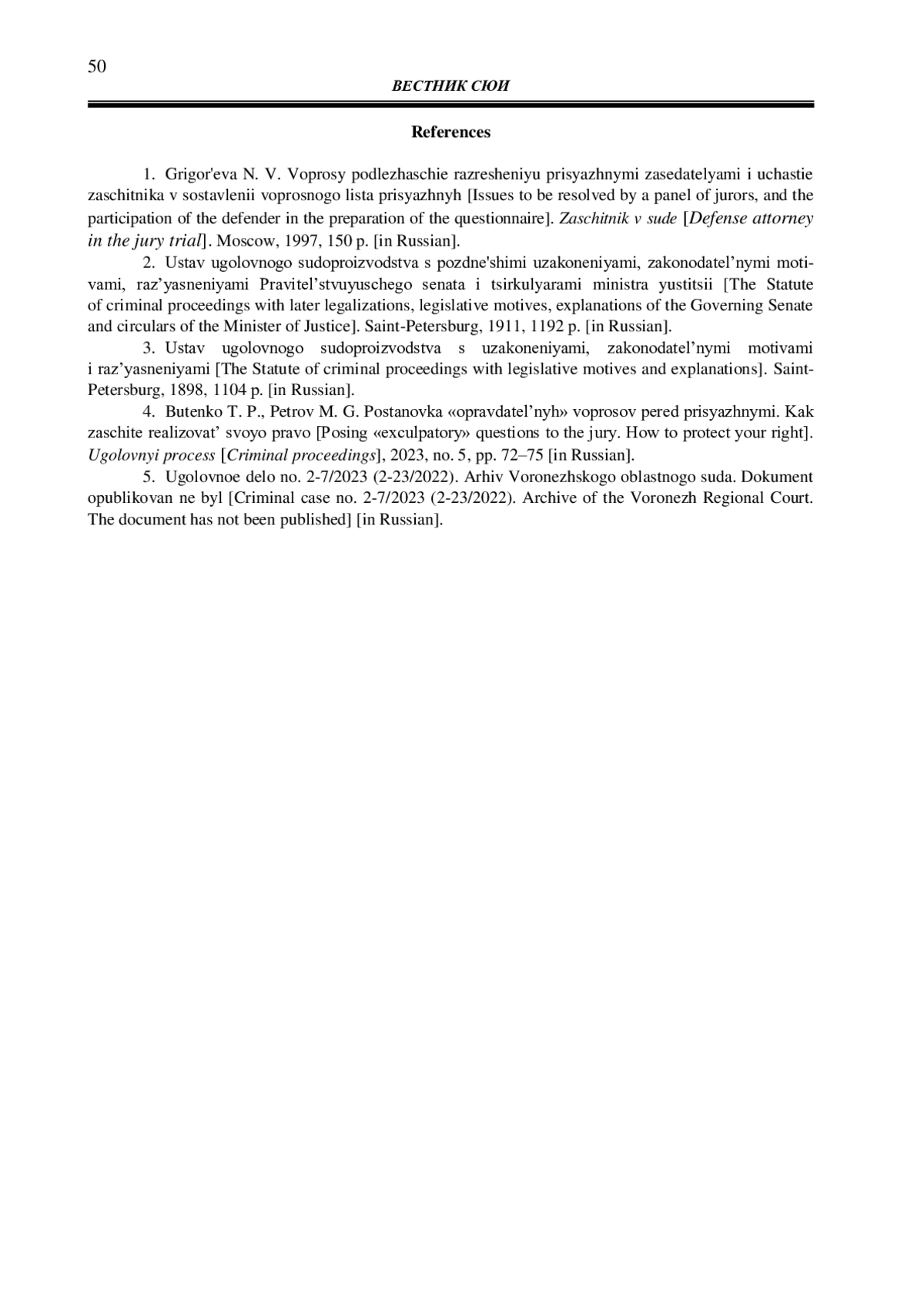 4. 	Бутенко Т. П., Петров М. Г. Постановка “оправдательных” вопросов перед присяжными. Как защите реализовать свое право // Уголовный процесс. 2023. № 5. С. 72-75. EDN: XZUESU