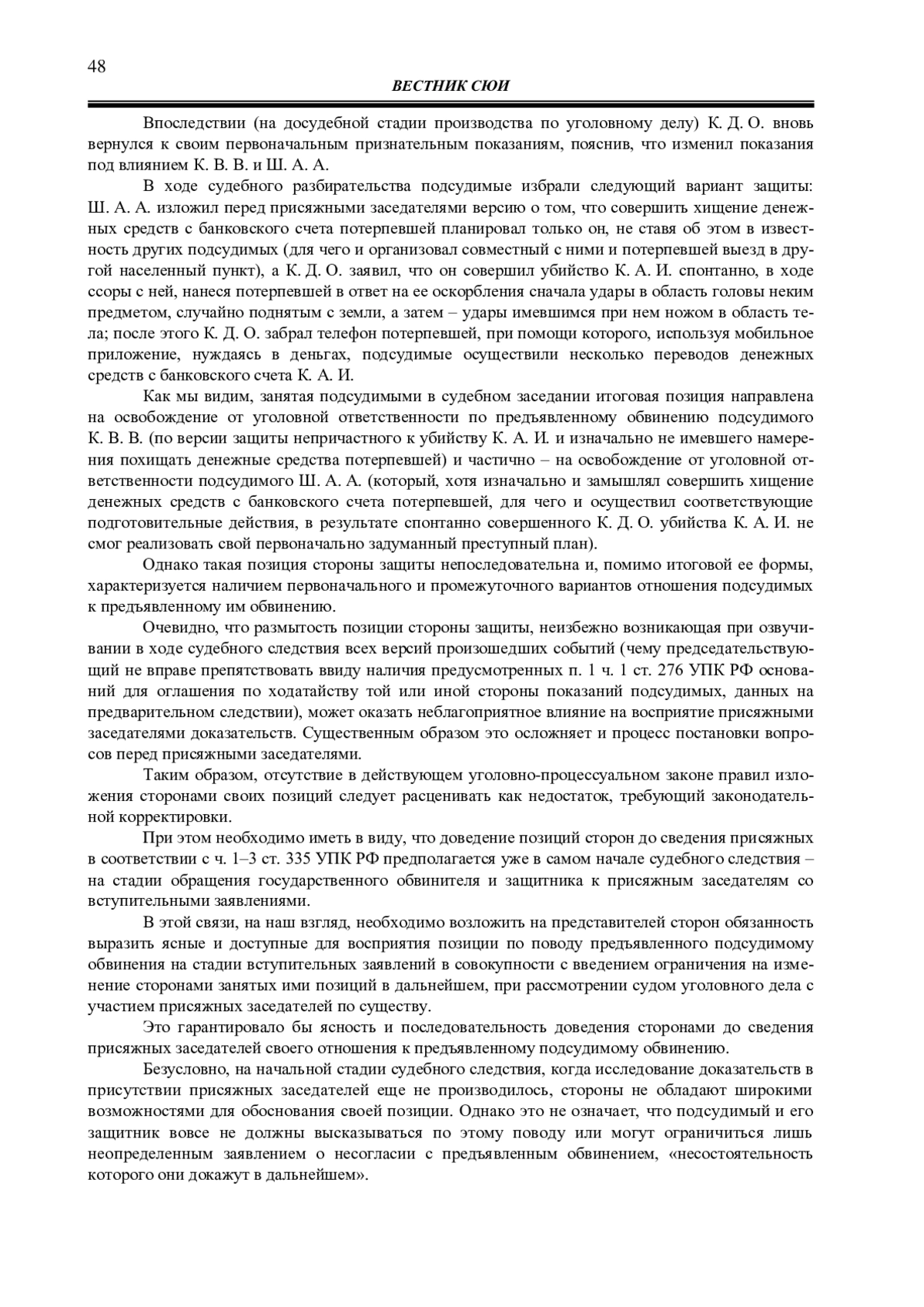 В качестве аргумента в пользу утверждения о несовершенстве диспозиции ст. 355 УПК РФ приводится пример из судебной практики, который демонстрирует уязвимость нормативной конструкции в тексте закона, в связи с чем предлагается дополнить названную статью ч. 3.1, в которой следует закрепить возможность утверждения председательствующим заявления стороны об изменении ранее озвученной во вступительном заявлении позиции при определенных условиях. Данные изменения, по мнению авторов, будут способствовать оптимизации производства в современном российском суде присяжных. Вместе с тем озвученные предложения не являются «руководством к действию» и призывают научное сообщество к активной дискуссии по обозначенной в статье проблеме.
