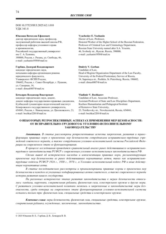 В статье рассмотрены ретроспективные аспекты закрепления, развития и трансформации правовых норм о применении мер безопасности сотрудниками исправительно-трудовых учреждений советского периода, а также сотрудниками уголовно-исполнительной системы Российской Федерации на современном этапе ее функционирования.