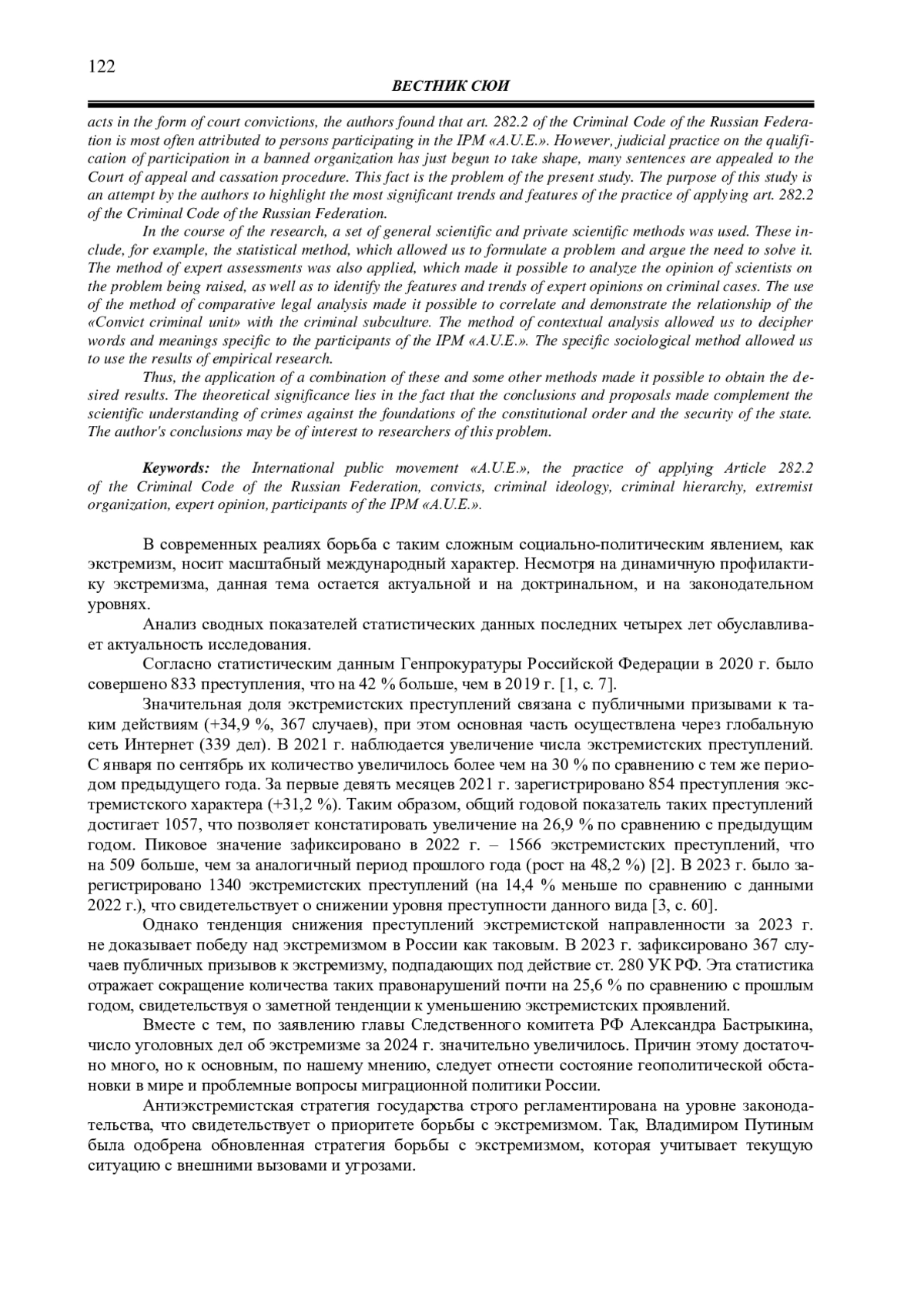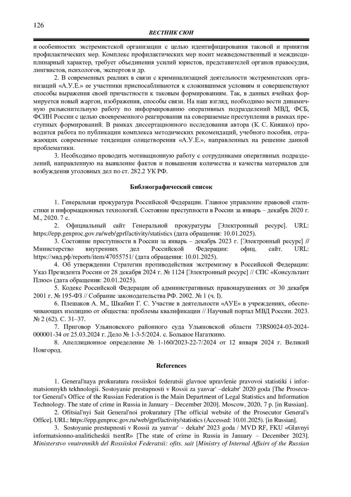 КЛИМОНОВ П. А., КИЯШКО К. С. НЕКОТОРЫЕ ПРОБЛЕМЫ И ОСНОВНЫЕ ТЕНДЕНЦИИ ПРАКТИКИ ПРИМЕНЕНИЯ СТ. 282.2 УК РФ В ОТНОШЕНИИ ЛИЦ, УЧАСТВУЮЩИХ В МОД «А. У. Е.» // ВЕСТНИК САМАРСКОГО ЮРИДИЧЕСКОГО ИНСТИТУТА. 2025. № 1 (62)