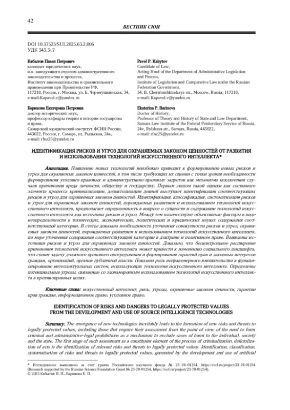 Появление новых технологий неизбежно приводит к формированию новых рисков и угроз для охраняемых законом ценностей, в том числе требующих их оценки с точки зрения необходимости формирования уголовно-правовых и административно-правовых запретов как механизма исключения случаев причинения вреда личности, обществу и государству. Первым этапом такой оценки как составного элемента процесса криминализации, деликтолизации деяний выступает идентификация соответствующих рисков и угроз для охраняемых законом ценностей. Идентификация, классификация, систематизация рисков и угроз для охраняемых законом ценностей, порождаемых развитием и использованием технологий искусственного интеллекта, предполагает определенность в вопросе о сущности и содержании технологий искусственного интеллекта как источника рисков и угроз. Между тем наличествуют объективные факторы в виде неопределенности в технических, экономических, политических и юридических науках содержания соответствующей категории. В статье доказана необходимость уточнения совокупности рисков и угроз, охраняемых законом ценностей, порождаемых развитием и использованием технологий искусственного интеллекта, по мере уточнения содержания соответствующей категории в доктрине и позитивном праве. Выявлены источники рисков и угроз для охраняемых законом ценностей. Доказано, что бесконтрольное расширение применения технологий искусственного интеллекта может привести к изменению социального ландшафта, что ставит задачу должного правового опосредования и формирования гарантий прав и законных интересов граждан, организаций, органов публичной власти. Показана роль неправомерного вмешательства в функционирование интеллектуальных систем, использующих технологии искусственного интеллекта. Определены потенциальные угрозы, связанные со злонамеренным использованием технологий искусственного интеллекта в противоправных целях.