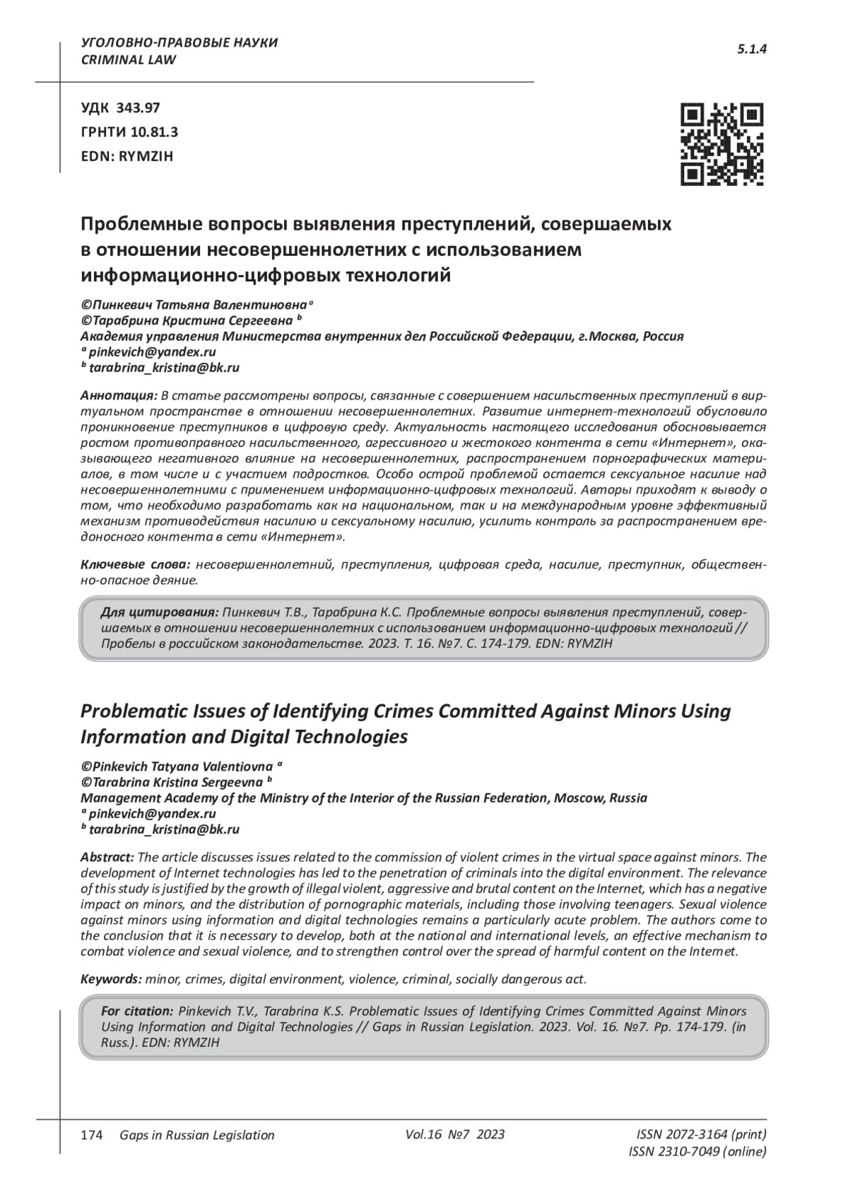 Tarabrina K.S. International principles for the prevention of violent crimes committed against minors using information and digital technologies / K.S. Tarabrina // Law and state: theory and practice. - 2023. - No. 4 (220). - pp. 327-329. EDN: HKNOQO