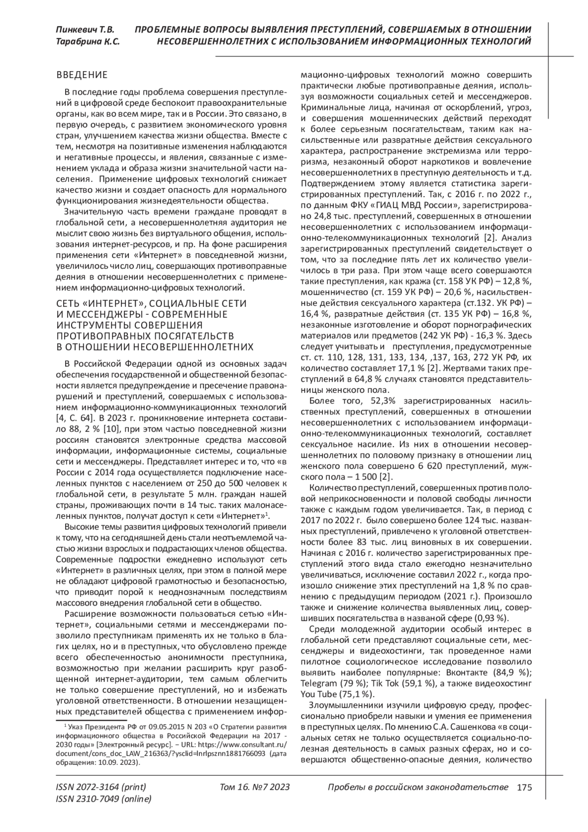 Sashenkov S. A. Criminogenic influence of social networks on minors / S. A. Sashenkov // Bulletin of the Voronezh Institute of the Ministry of Internal Affairs of Russia. - 2015. - No. 3. - P. 215-219. EDN: UMIFUT