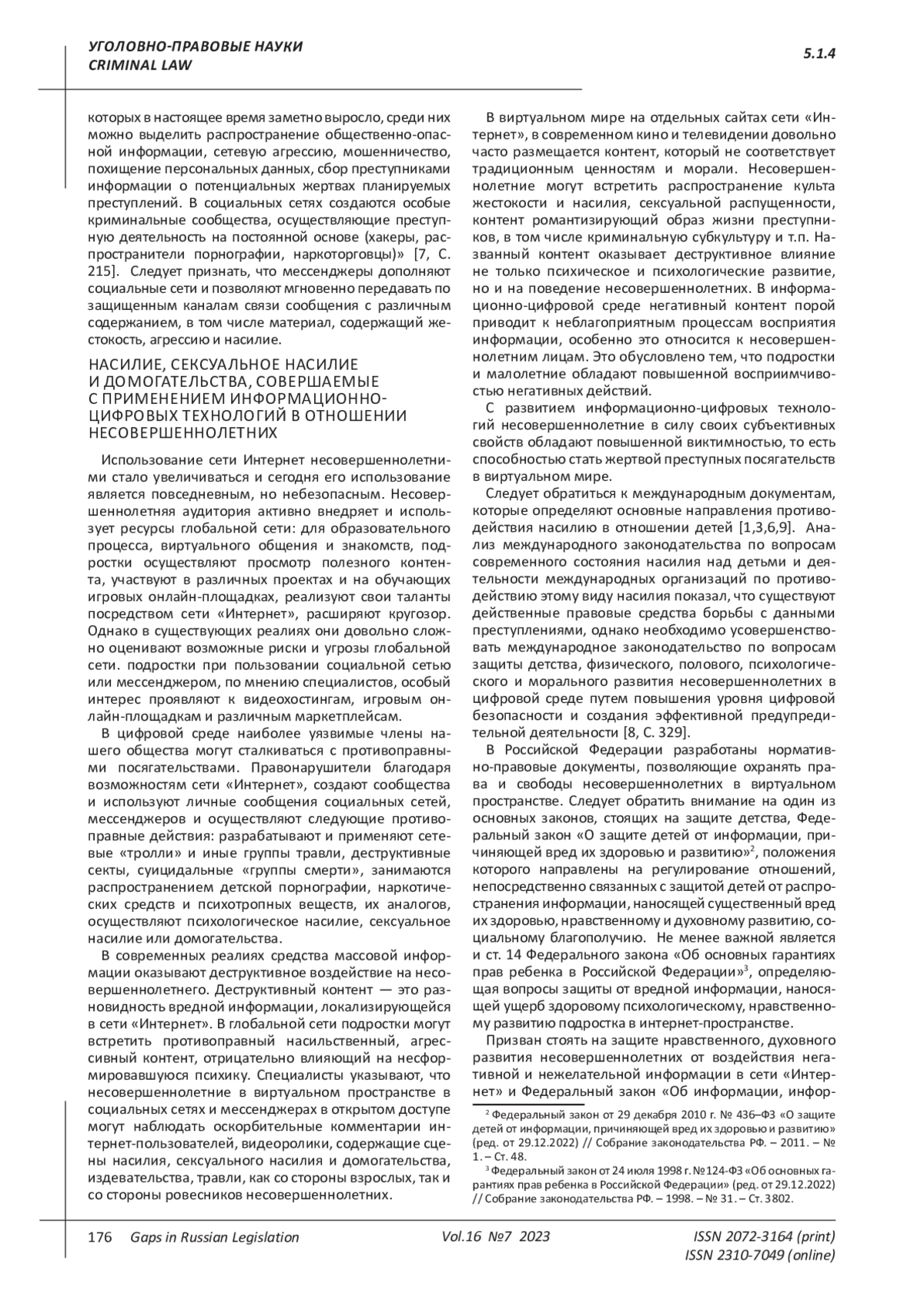 7. 	Сашенков С. А. Криминогенное влияние социальных сетей на несовершеннолетних / С. А. Сашенков // Вестник Воронежского института МВД России. - 2015. - № 3. - С. 215-219. EDN: UMIFUT