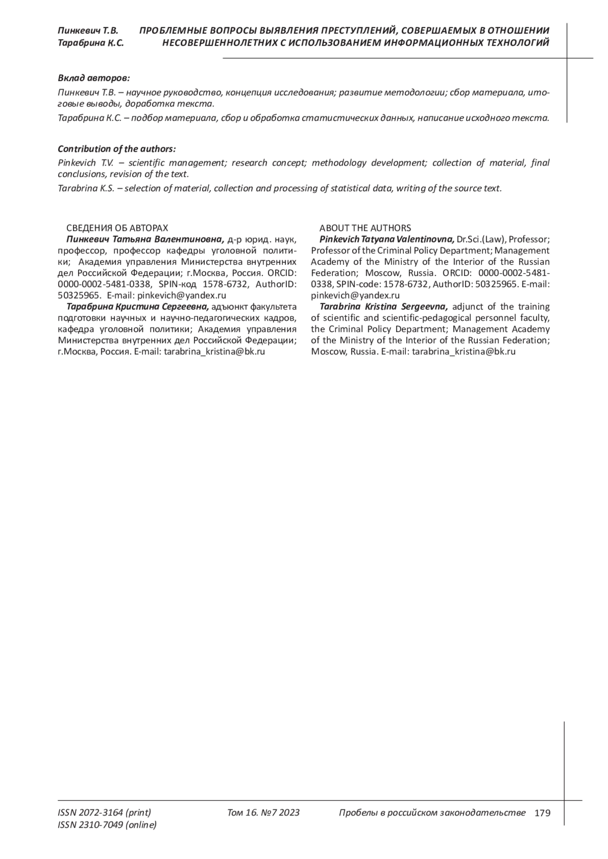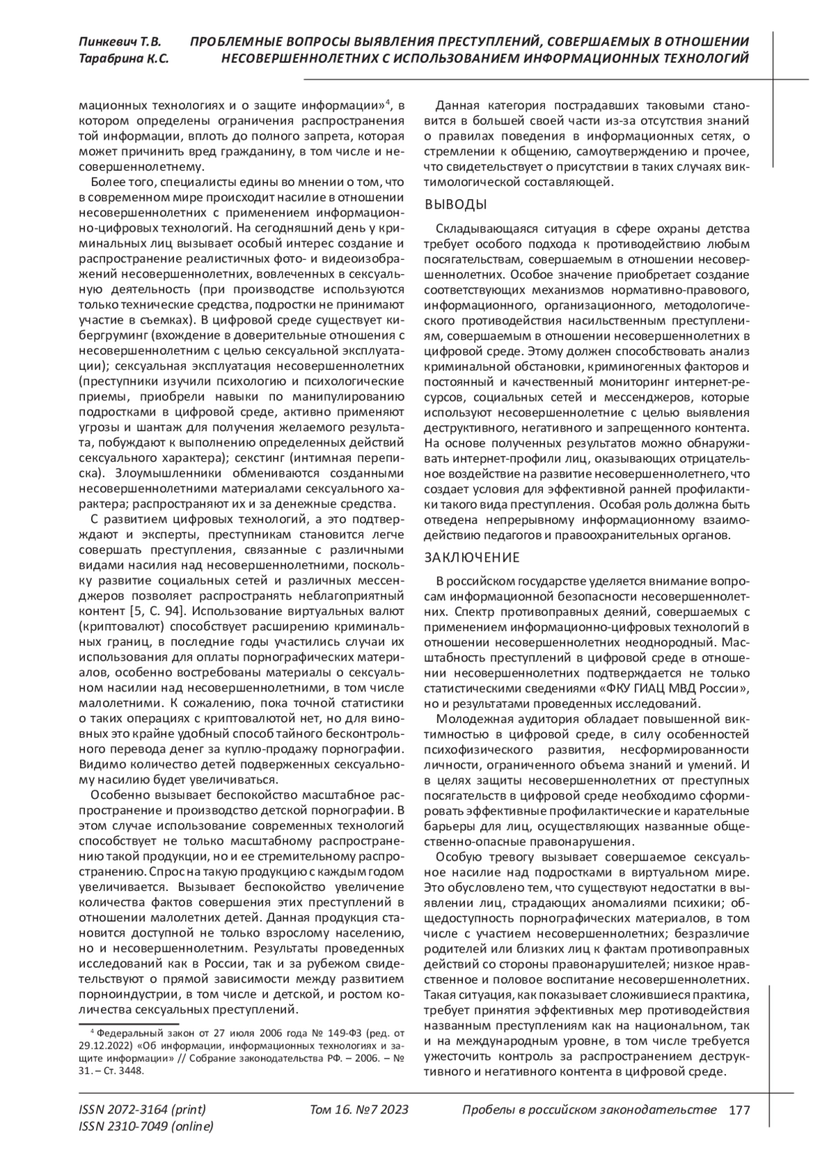 8. 	Тарабрина К.С. Международные основы предупреждения насильственных преступлений, совершаемых в отношении несовершеннолетних с использованием информационно-цифровых технологий/ К.С. Тарабрина// Право и государство: теория и практика. - 2023. - №4 (220). - C. 327-329.