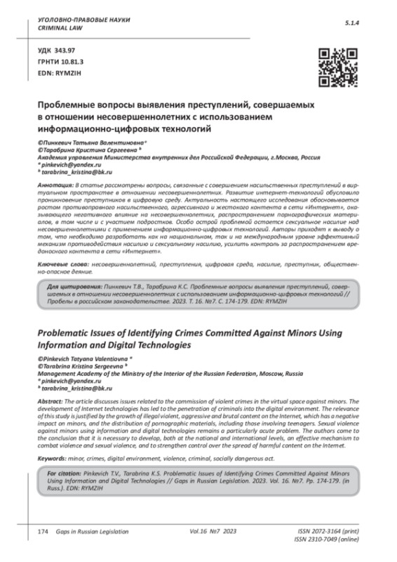 В статье рассмотрены вопросы, связанные с совершением насильственных преступлений в виртуальном пространстве в отношении несовершеннолетних. Развитие интернет-технологий обусловило проникновение преступников в цифровую среду. Актуальность настоящего исследования обосновывается ростом противоправного насильственного, агрессивного и жестокого контента в сети «Интернет», оказывающего негативного влияние на несовершеннолетних, распространением порнографических материалов, в том числе и с участием подростков. Особо острой проблемой остается сексуальное насилие над несовершеннолетними с применением информационно-цифровых технологий. Авторы приходят к выводу о том, что необходимо разработать как на национальном, так и на международным уровне эффективный механизм противодействия насилию и сексуальному насилию, усилить контроль за распространением вредоносного контента в сети «Интернет».