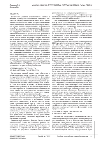 В статье представлены результаты исследования нелегальной деятельности на финансовом рынке России в которой проведен анализ деятельности организованной преступности по созданию финансовых пирамид инвестиционных платформ, нелегальной деятельности в сфере кредитования и страхового рынка. Целью исследования является изучение финансового рынка России и влияние на уровень его безопасности деятельности организованной преступности. С развитием цифровой экономики и внедрением информационно-телекоммуникационных технологий в данной сфере, возросла возможность роста экономического и инновационного развития, укрепление финансовой составляющей государства. Вместе с тем при развитии экономической сферы возрастает угроза негативных проявлений, в том числе роста преступности, особенно ее организованной части на финансовом рынке. Усугубляет ситуацию тот факт, что современная организованная преступность отличается высокой сплоченностью преступных групп и сообществ, объединяющих большое количество лиц, способных установить контроль над различными системами жизнедеятельности общества и государства, входящими не только в сектор бизнеса и коммерции, но и в бюджетный сектор, где продолжая устанавливать монопольный контроль. В заключении авторы приходят к выводу о том, что на финансовом рынке российского государства не в полном объеме используются средства обеспечения криминологической безопасности финансового рынка.