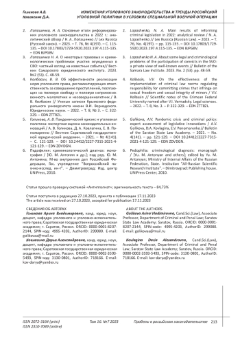 Lopashenko, N. A. Main results of reforming criminal legislation in 2022: analytical review / N. A. Lopashenko // Lex Russica (Russian Law). - 2023. - T. 76, No. 4(197). - pp. 115-135. DOI: 10.17803/1729-5920.2023.197.4.115-135 EDN: BJPGBV