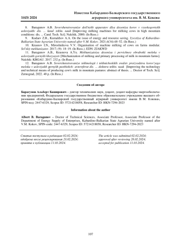 12. Барагунов А. Б. Совершенствование технологии и технических средств производства коровьего молока в условиях горных пастбищ: автореф. дис. … доктора техн. наук. Зерноград, 2022. 40 с. EDN: OCHFUA