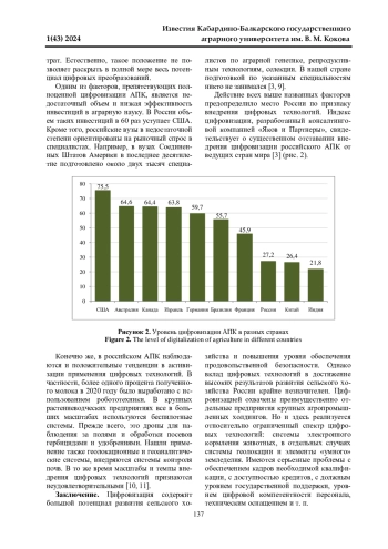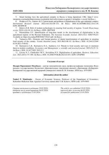 6. Пешкова Г. Ю., Фѐдоров К. Ф. Актуальные тенденции и проблемы цифровизации АПК // Международный научно-исследовательский журнал. 2022. № 4-4 (118). C. 150-153. DOI: 10.23670/IRJ.2022.118.4.139 EDN: HCBWCH