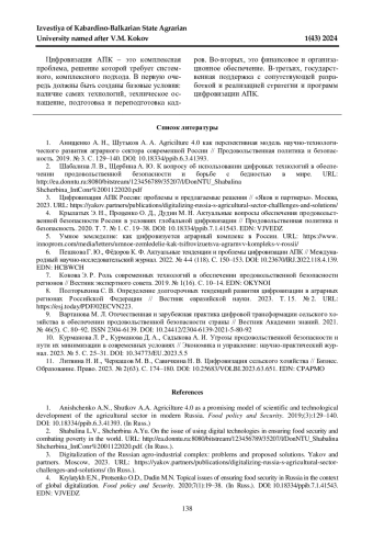 1. Анищенко А. Н., Шутьков А. А. Agricilture 4.0 как перспективная модель научно-технологического развития аграрного сектора современной России // Продовольственная политика и безопасность. 2019. № 3. С. 129-140. DOI: 10.18334/ppib.6.3.41393 EDN: LKKKGI