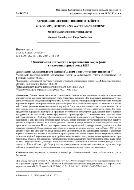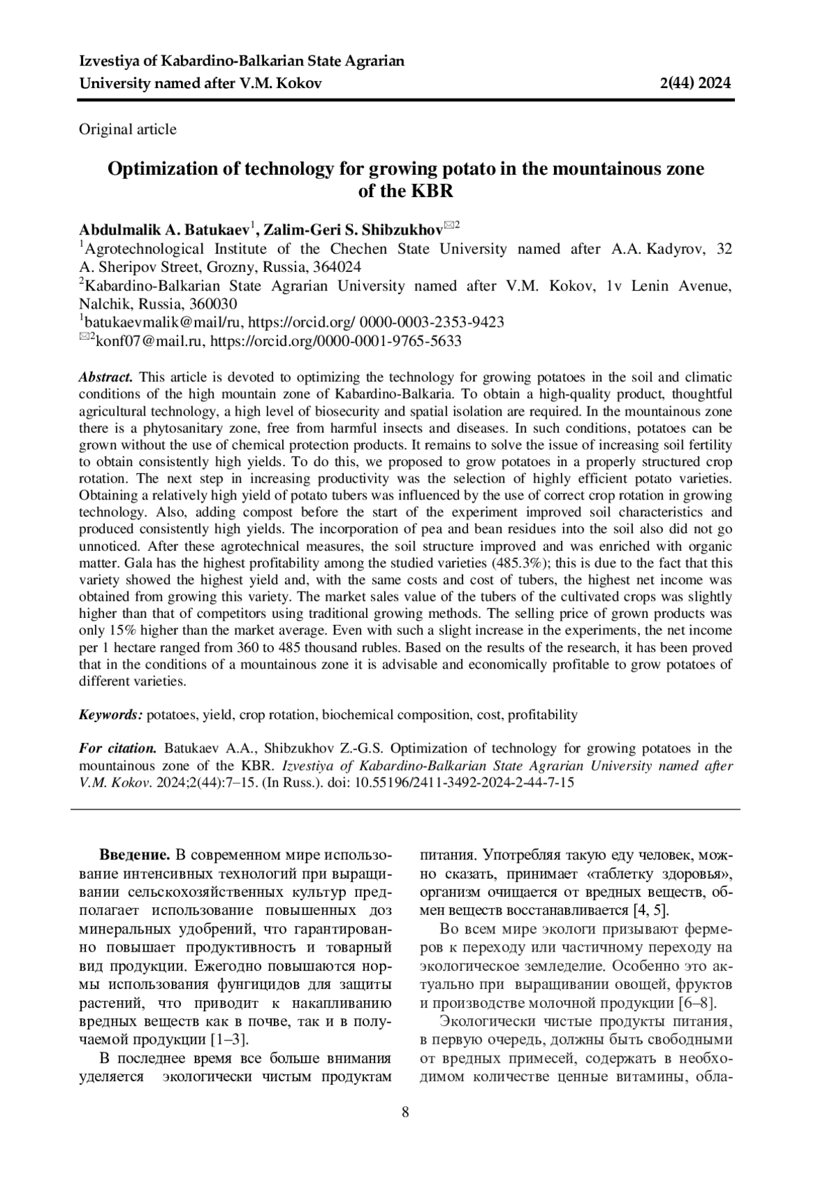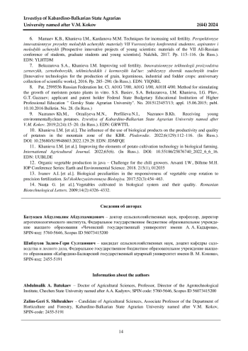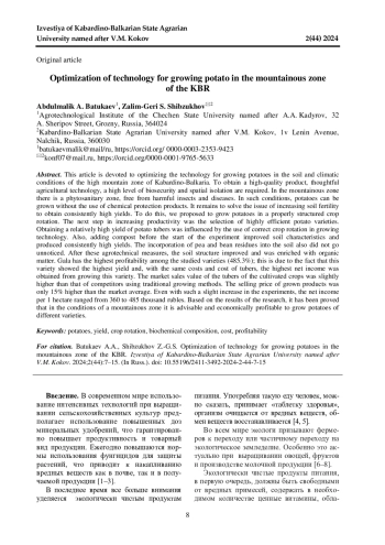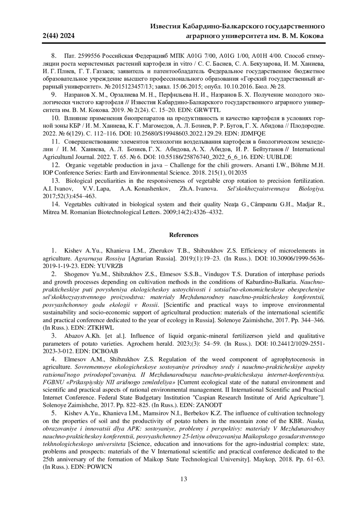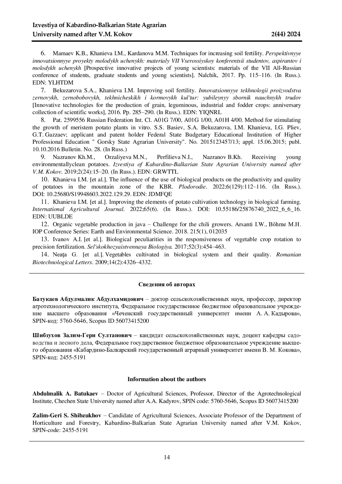 11. 	Совершенствование элементов технологии возделывания картофеля в биологическом земледелии / И. М. Ханиева, А. Л. Бозиев, Г. Х. Абидова, А. Х. Абидов, И. Р. Бейтуганов // International Agricultural Journal. 2022. Т. 65. № 6. DOI: 10.55186/25876740_2022_6_6_16 EDN: UUBLDE