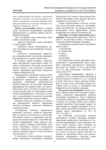 10. 	Влияние применения биопрепаратов на продуктивность и качество картофеля в условиях горной зоны КБР / И. М. Ханиева, К. Г. Магомедов, А. Л. Бозиев, Р. Р. Бугов, Г. Х. Абидова // Плодородие. 2022. № 6(129). С. 112-116. DOI: 10.25680/S19948603.2022.129.29 EDN: JDMFQE