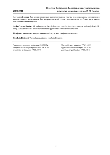 Данная статья посвящена изучению влияния стимулятора роста растений и комплексного водорастворимого удобрения на хозяйственно-ценные признаки и зерновую продуктивность гибридов кукурузы. Полевые эксперименты проводились в 2021-2023 гг. в учебно-производственном комплексе Кабардино-Балкарского государственного аграрного университета имени В. М. Кокова. Опыты закладывались на черноземе выщелоченном. Опытный участок характеризуется следующими агрохимическими показателями: содержимое гумуса в пахотном горизонте - 3,3%, общий азот - 0,28%, емкость поглощения - 34,4 мг∙эквивалент на 100 грамм почвы, реакция почвенного раствора нейтральная (рН - 7). Содержание подвижного фосфора составляет 15,0 мг на 100 г почвы, то есть средняя обеспеченность (по Чирикову), обеспеченность обменным калием повышенная - 15-18 мг на 100 г почвы (по Чирикову). По механическому составу эта почва тяжелосуглинистая. Содержание в ней физической глины составляет 57%. Целью исследований было определение влияния стимулятора роста растений и комплексного водорастворимого удобрения на хозяйственно-ценные признаки и зерновую продуктивность среднераннего гибрида кукурузы Родник 292 МВ и среднеспелого гибрида кукурузы Диана МВ. Установлено, что применение стимулятора роста растений Регоплант и комплексного водорастворимого удобрения Плантафол увеличили высоту растения на 3,7%, длину початка на 10,6-13,5%, количество зѐрен в початке на 24,2-26,3%, массу зерна с одного початка на 15,8-35,9% и массу 1000 зѐрен на 7,5-9,4%, а также максимально увеличило урожайность у гибрида Родник 292 МВ до 8,16-8,96 т/га и гибрида Диана МВ до 10,0-10,32 т/га, где сбор кормовых единиц достигал 12,6-13,8 т/га для гибрида кукурузы Родник 292 МВ и у гибрида Диана МВ - 15,7-16,1 т/га. При этом содержание белка выросло у гибридов кукурузы Родник 292 МВ до 13,2-18,4% и Диана МВ до 11,8-29,4%.