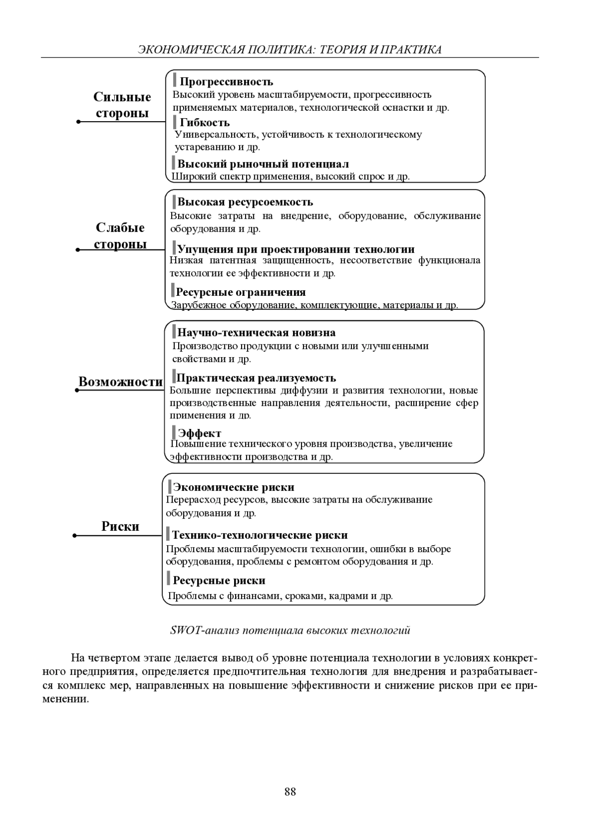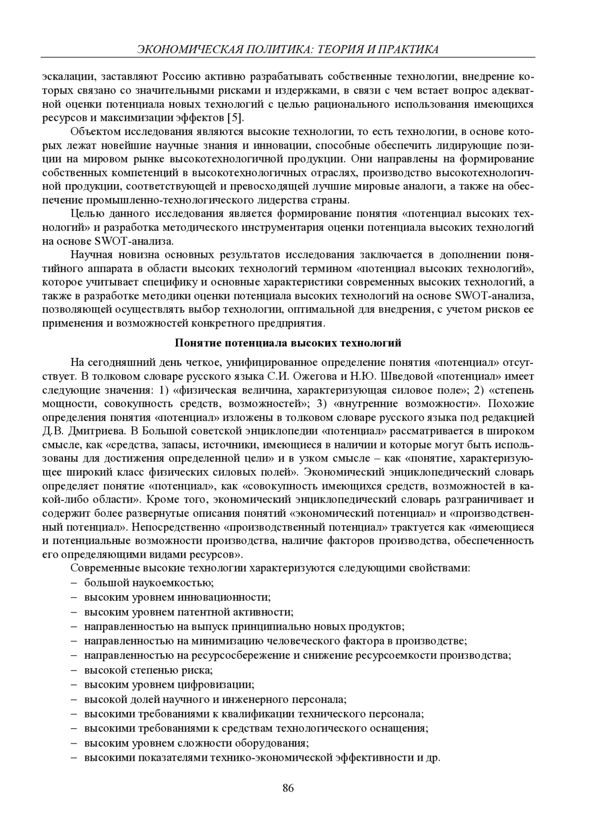 Статья посвящена вопросу использования SWOT-анализа для оценки потенциала высоких технологий. Актуальность исследования обоснована высокими затратами и рисками при внедрении высоких технологий, в связи с чем решение о внедрении таких технологий требует комплексного анализа. В статье имеются элементы научной новизны в части использования в рамках предлагаемого методического подхода SWOT-анализа, позволяющего не только своевременно выявлять потенциальные риски и проблемы при внедрении высоких технологий, но и оценить их преимущества и потенциальные возможности. Использование результатов исследования позволит повысить эффективность управленческих решений и снизить риски при внедрении высоких технологий на отечественных предприятиях