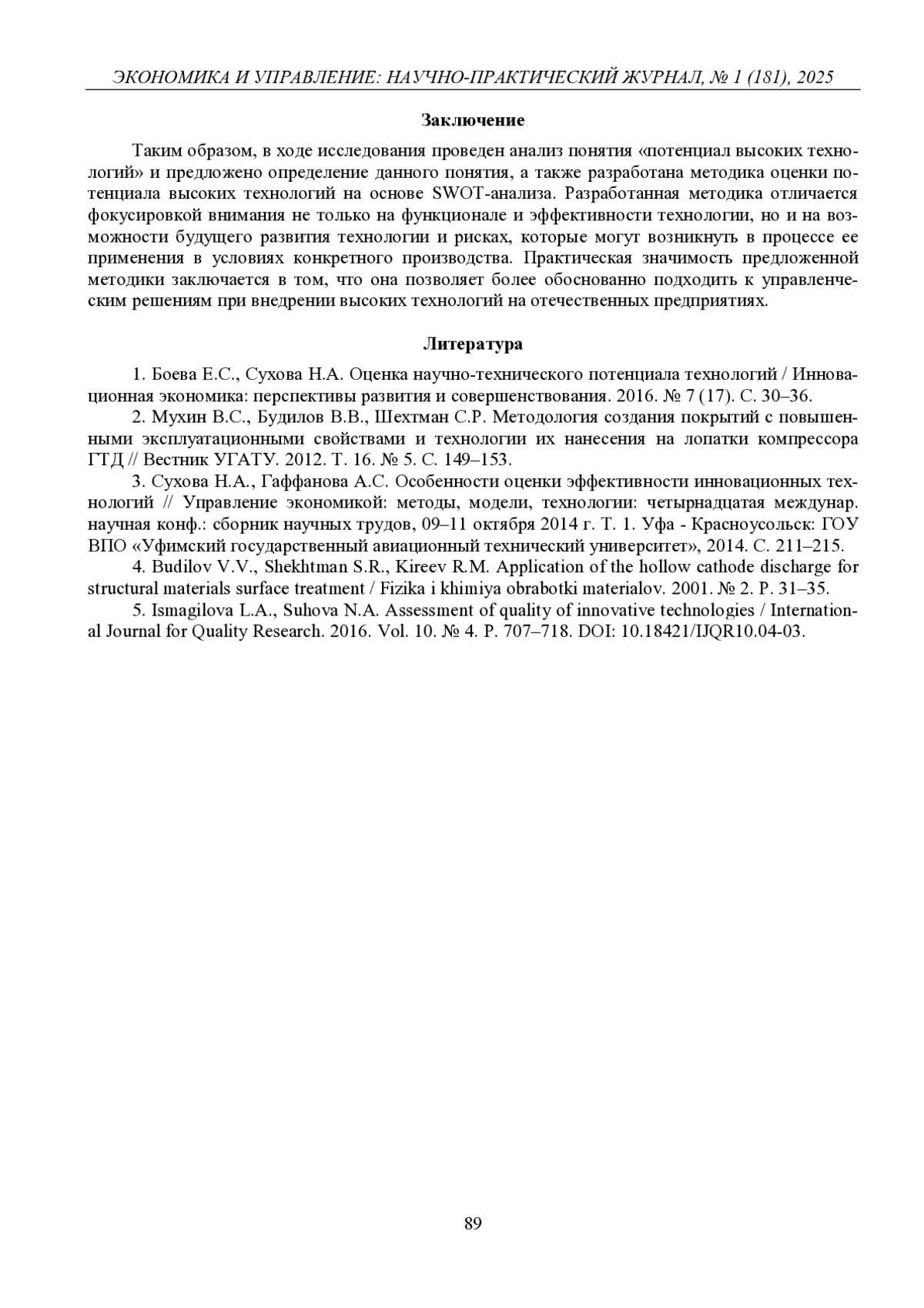 5. 	Ismagilova L.A., Suhova N.A. Assessment of quality of innovative technologies / International Journal for Quality Research. 2016. Vol. 10. № 4. P. 707-718.  DOI: 10.18421/IJQR10.04-03  EDN: YUXYHV
