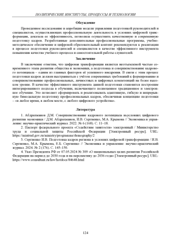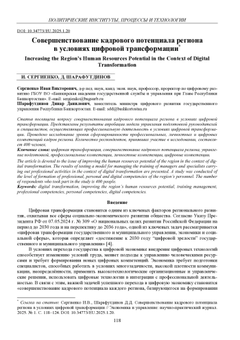 3. Сергиенко И.В. Подготовка кадров региона в условиях цифровой трансформации / И.В. Сергиенко, М.А. Крымова, Е.Б. Сергиенко // Экономика и управление: научно-практический журнал. 2024. № 2 (176). С. 145-150.
